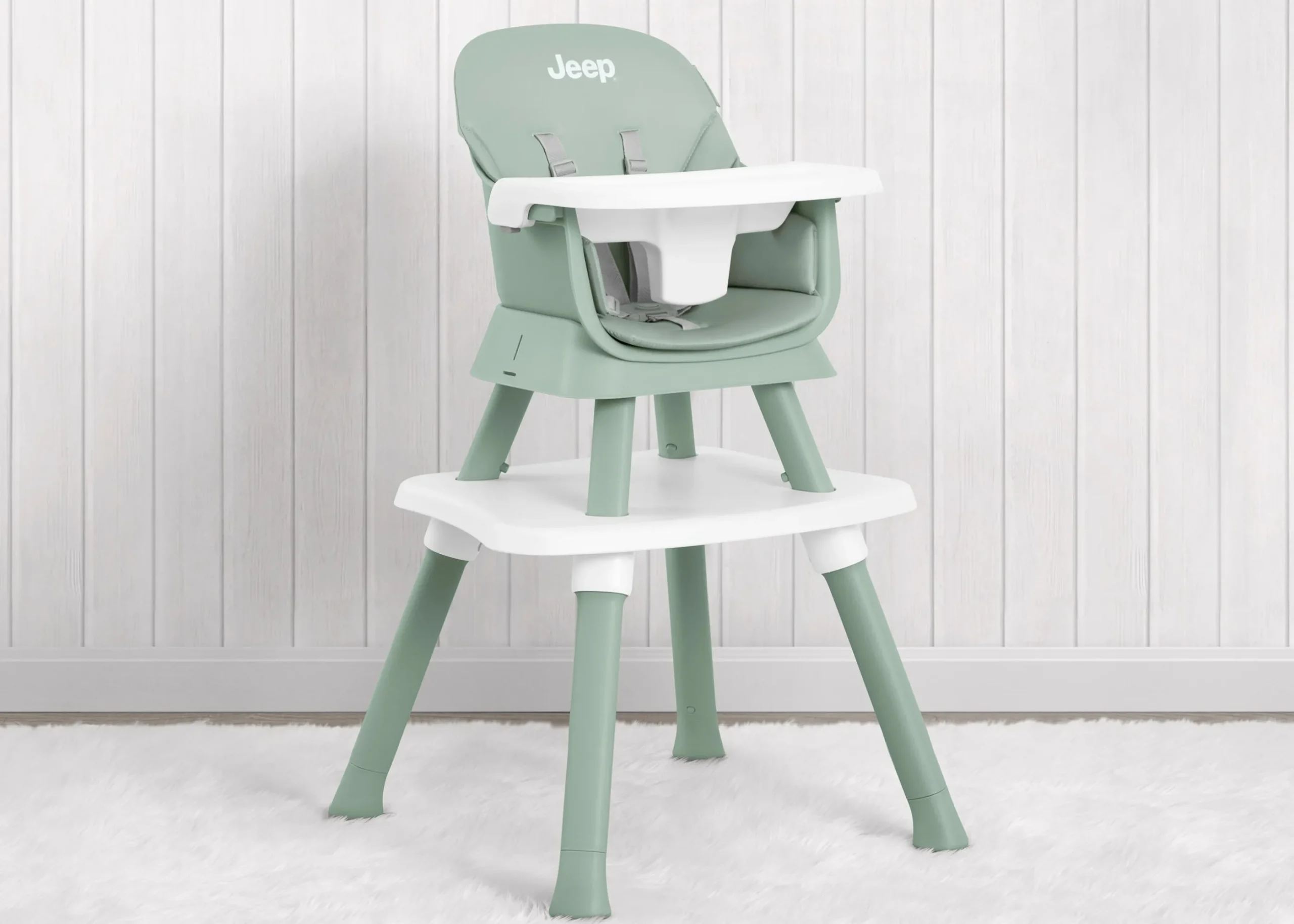 The Jeep Milestone 6-in-1 High Chair by Delta Children was especially designed for your child over their first few years. As they develop, the Milestone easily transforms from a high chair to a stool, booster seat, floor toddler chair, activity table and a handy desk and chair. The perfect place for your child to eat, discover and grow. Easy to clean, the water-resistant leatherette seat cover and smooth surfaces make for quick cleanups. The adjustable meal tray with three positions ensures your child’s comfort.