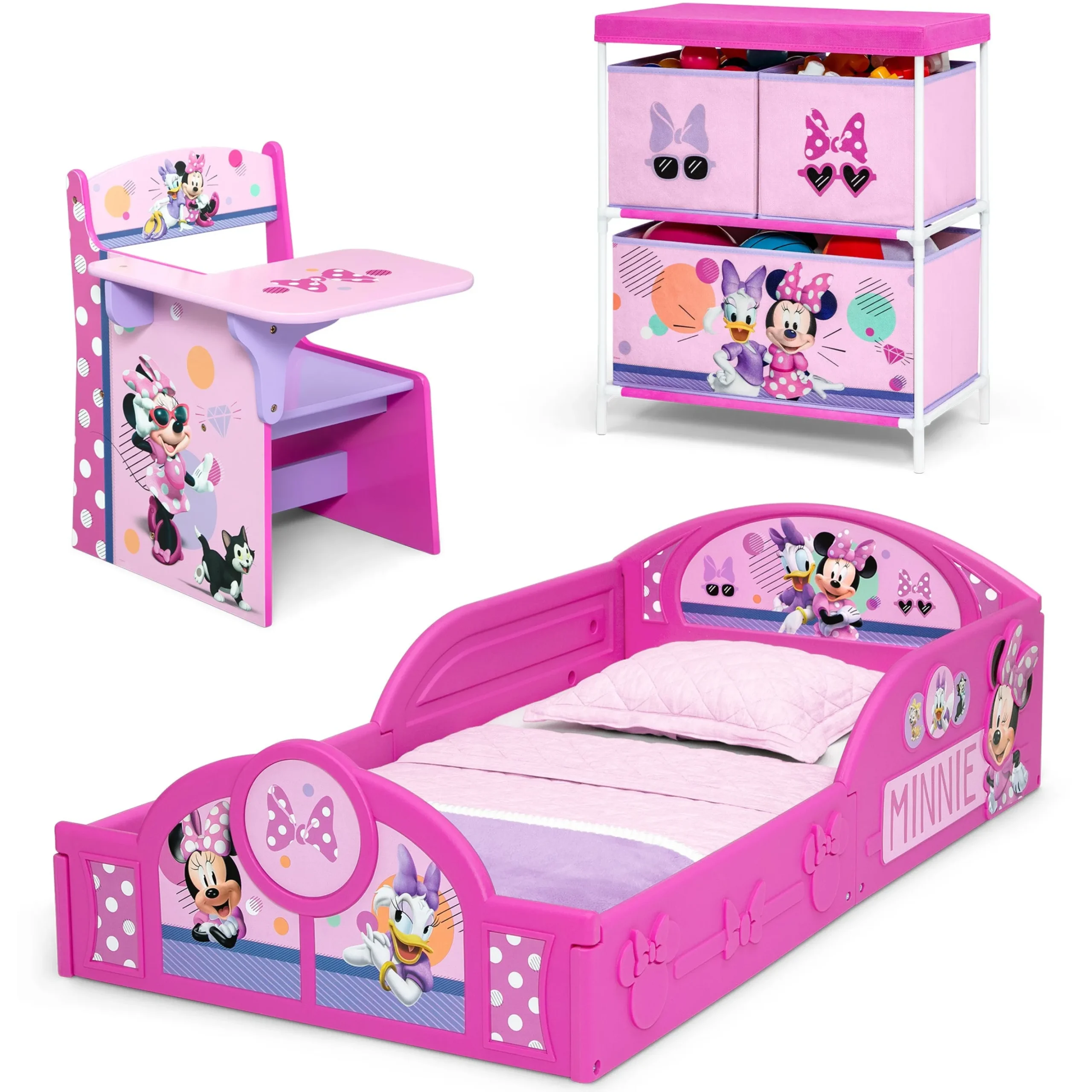 Kids love themed bedroom sets—and this Disney Minnie Mouse 3-Piece Toddler Bedroom Set by Delta Children is the best there is! This colorful bedroom set with Minnie Mouse graphics includes all the pieces you need to create the room of their dreams, like a Sleep and Play Toddler Bed, Toy Organizer with 3 Fabric Bins and a Chair Desk. The Sleep and Play Toddler Bed features a low mattress height and built-in guardrails that make it the best option for your child’s first big-kid bed, giving them the independence they crave while keeping them safe throughout the night. The bed’s versatile plastic frame can also be used as a play enclosure or a ton of other fun things, like a ball pit (play balls not included). The Toy Organizer with 3 Fabric Bins features three fabric toy bins in two different sizes to stow a ton of toys. The Chair Desk provides the perfect space for your child to do homework, art projects or eat. Get the Disney Minnie Mouse 3-Piece Toddler Bedroom Set by Delta Children today!