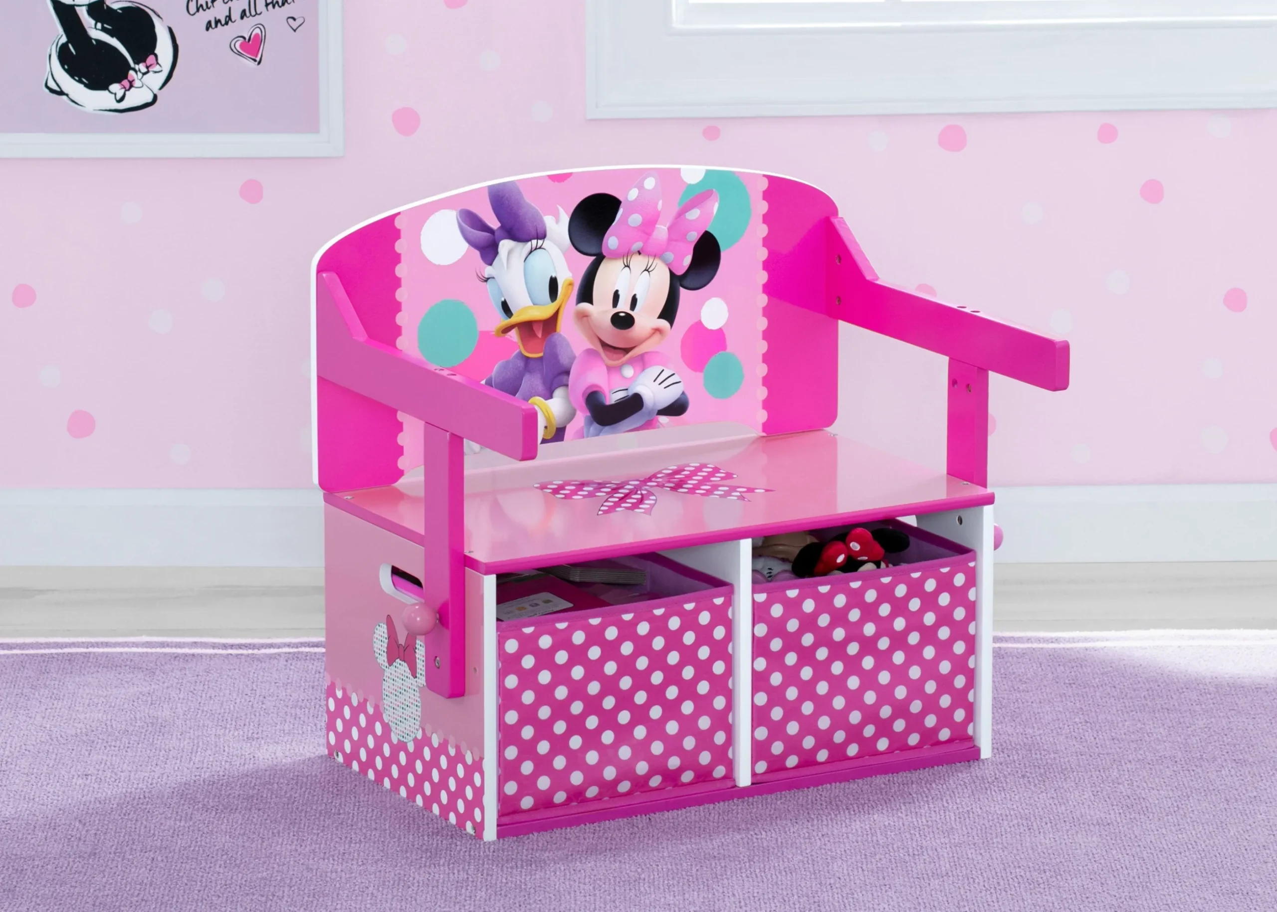 Bring home the fun-looking charm of the Minnie Mouse Activity Bench. It’s 2-in-1 design converts from a storage bench to a desk in seconds. An adorable addition to your child’s Clubhouse, this clever activity bench will have your child smiling from ear-to-ear when they see the pink finish and graphics of Minnie, bows, polka dots, and more.