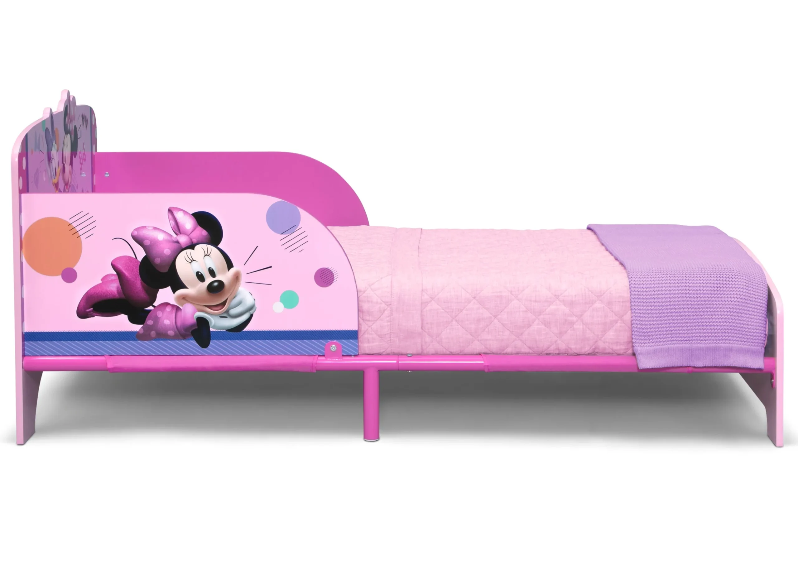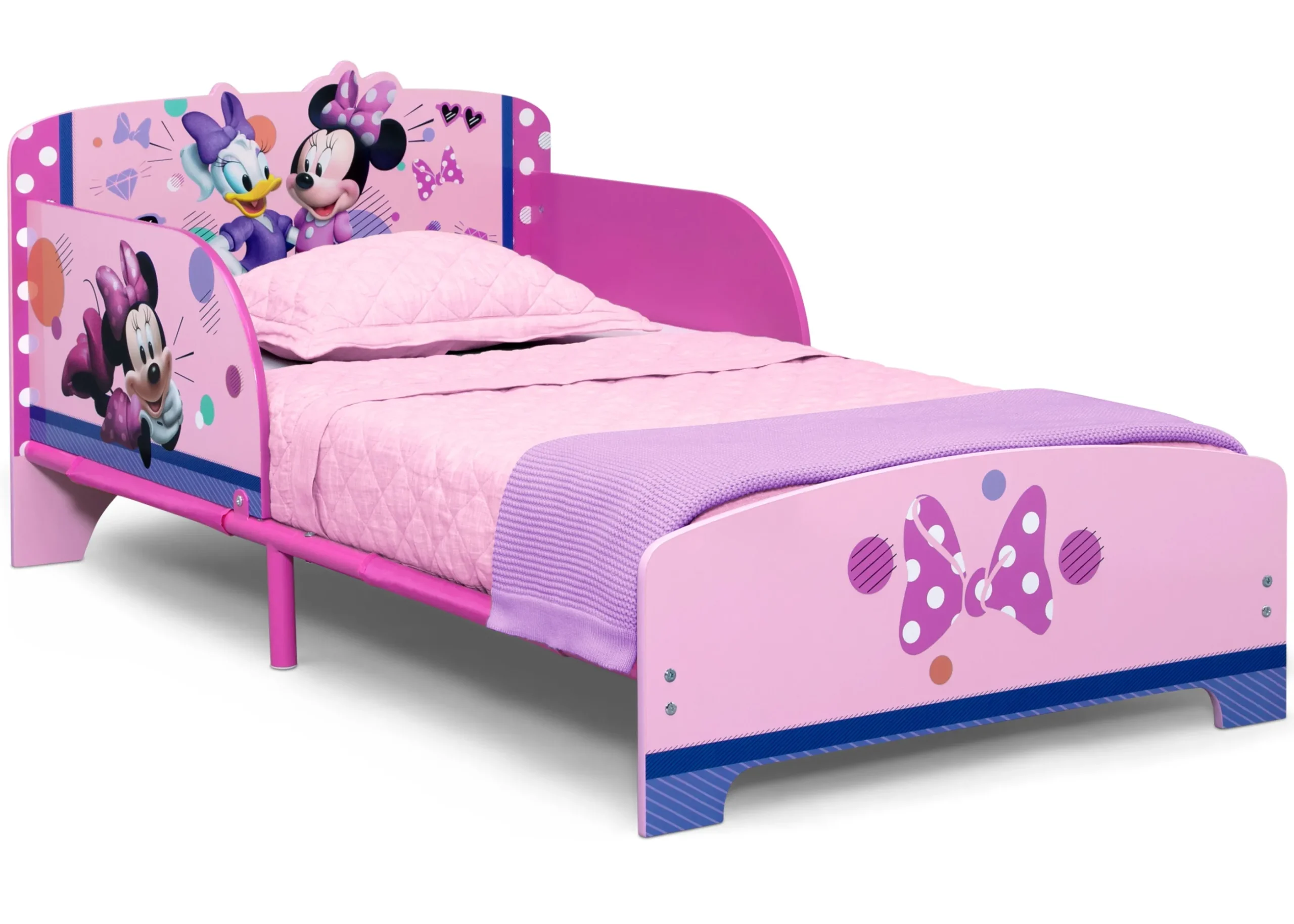 The playful Disney Minnie Mouse Wood & Metal Toddler Bed by Delta Children is designed to deliver pleasant dreams. Adorned with colorful graphics of Minnie and her friends, this sturdy wooden toddler bed with metal and fabric mattress support will help your little one easily transition to a “big kid” bed. The bed features two attached guardrails and is the perfect kid-sized height, which allows your child to get in and out on their own.