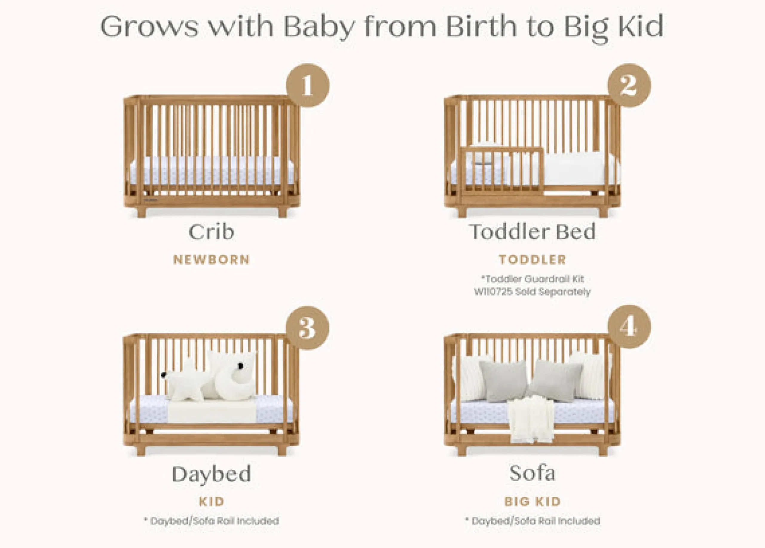 With a unique 4-in-1 design, the Nest 4-in-1 Convertible Crib can grow right alongside your little one. Watch it transform from a crib with three adjustable mattress heights, to a toddler bed, a daybed, and finally to a sofa (Daybed/Sofa Rail included, Toddler Guardrail #W110725 sold separately)