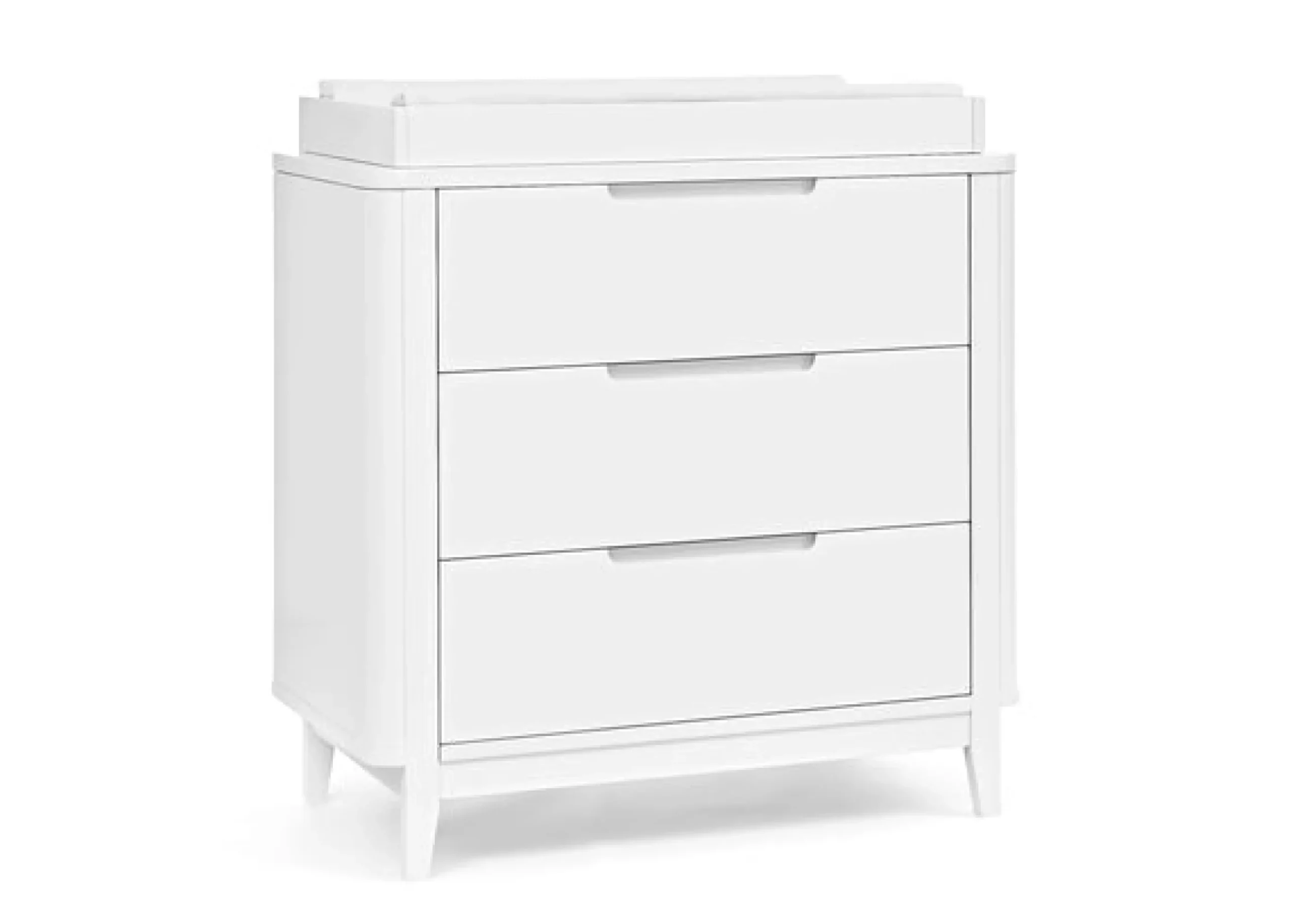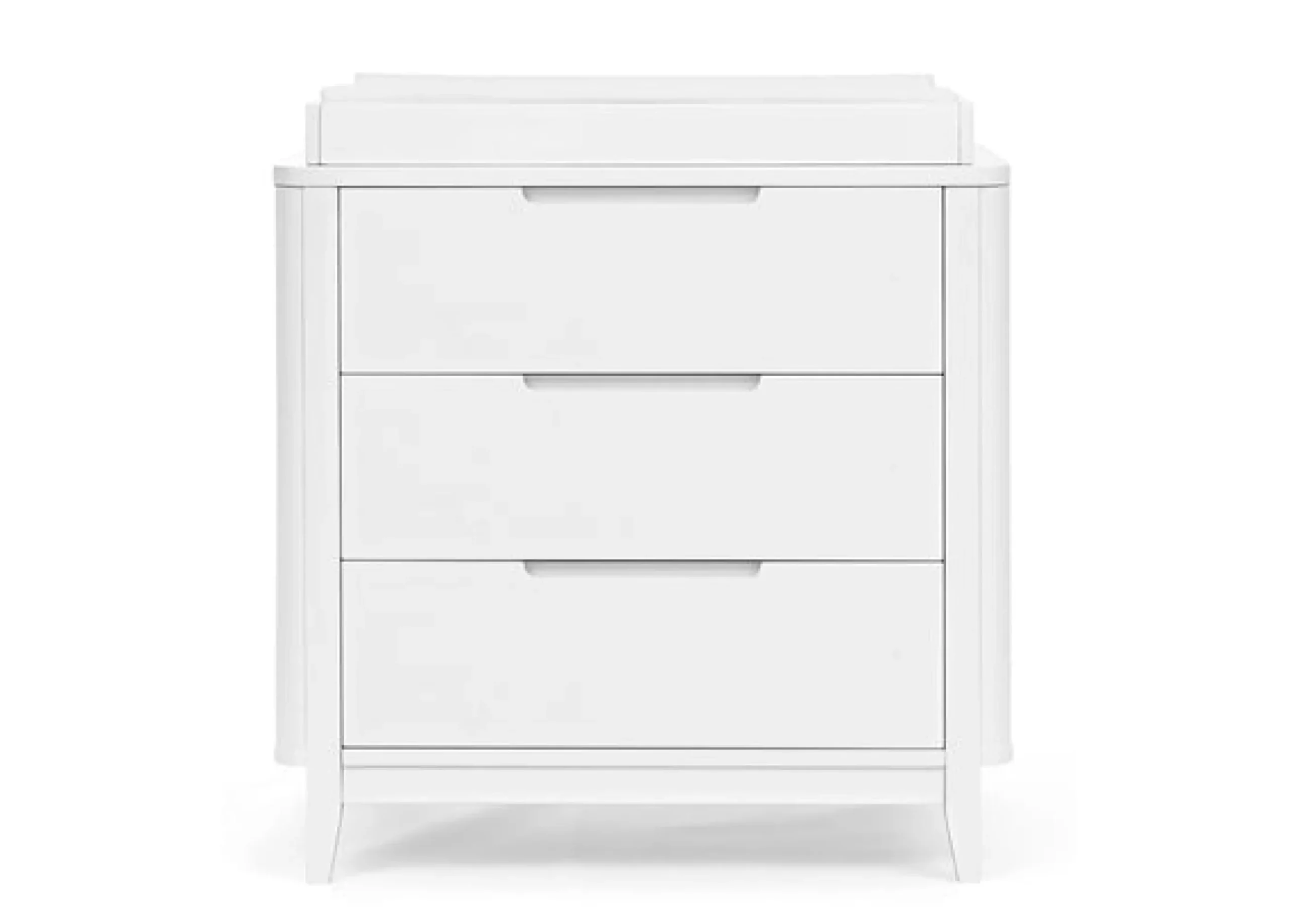 The Noah 3 Drawer Dresser with Changing Top by Delta Children features three spacious drawers with cutout handles, rounded corners and tapered feet for a streamlined, modern look. This spacious storage piece serves as a sturdy changing table too, with the included changing topper (changing pad sold separately). When your child grows, just remove the topper, it easily transitions into a stand-alone dresser. For your child’s safety, this dresser is outfitted with an interlocking drawer system that limits the number of drawers that can be opened at one time. Available in Natural Sandstone, Teak Brown and Bianca White. To complete the look, pair this dresser with the coordinating Noah 4-in-1 Convertible Crib.This dresser is tested to meet the current requirements of ASTM F2057, the mandatory CPSC safety standard that protects young children from furniture tip-over incidents. For your children’s safety, only purchase dressers that comply with this standard. For additional security, Delta strongly recommends that all dressers in your home be anchored; all Delta dressers include a wall anchor. To learn how to properly secure your dresser, please see the product assembly instructions or visit our website.
