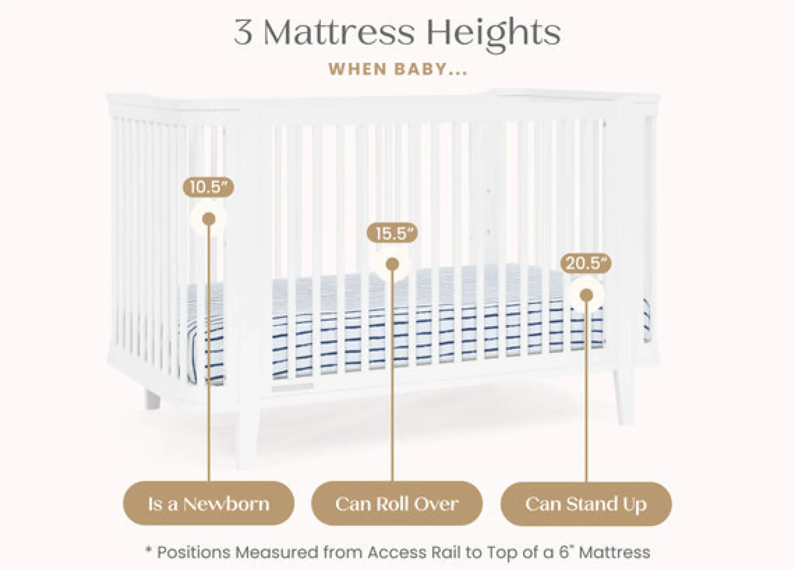 - Adjustable height mattress support with 3 convenient positions to grow with your baby | From Floor: 34.5″; From Top Mattress Support Position: 16.25″; From Bottom Mattress Support Position: 26.5″