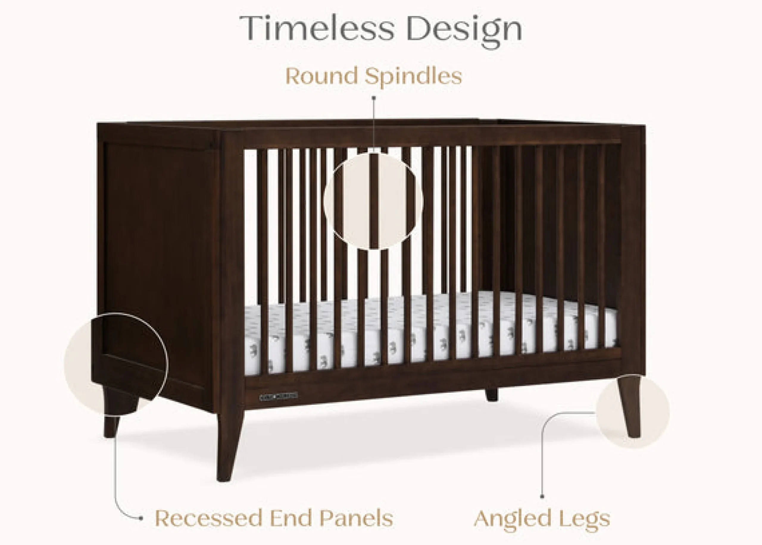 The Ollie 4-in-1 Convertible Crib by Delta Children effortlessly captures the mid-century modern look with its clean lines, spindles and angled legs