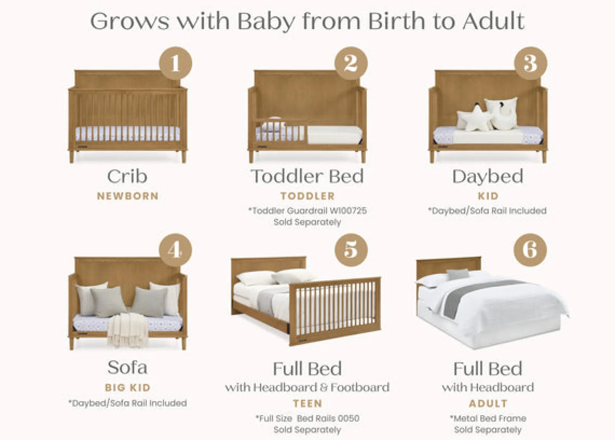 - Crib converts to a toddler bed, daybed, sofa, full bed with and without footboard (Daybed/Sofa Rail included; Toddler Guardrail #W100725 and Full Size Wood Bed Rails #0050 or standard bed frame for headboard only, sold separately)