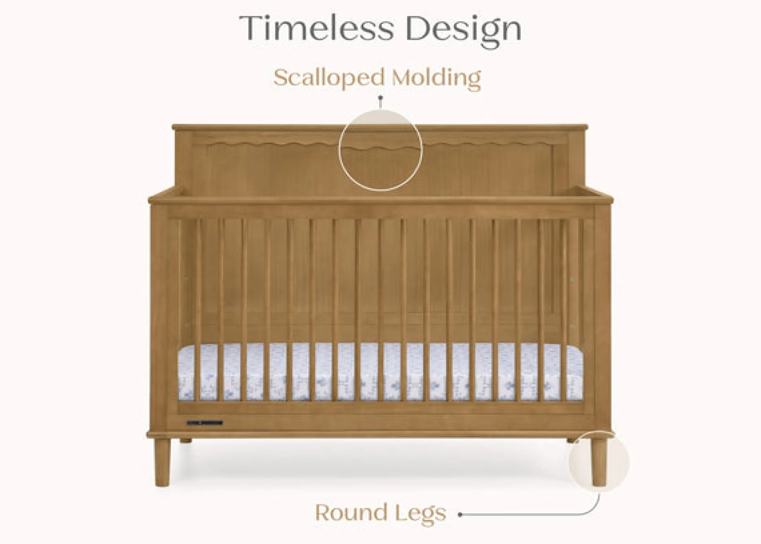 With charming scalloped molding, the Penelope 6-in-1 Convertible Crib by Delta Children adds a sculptural element to your nursery with its elegant “wave” detailing