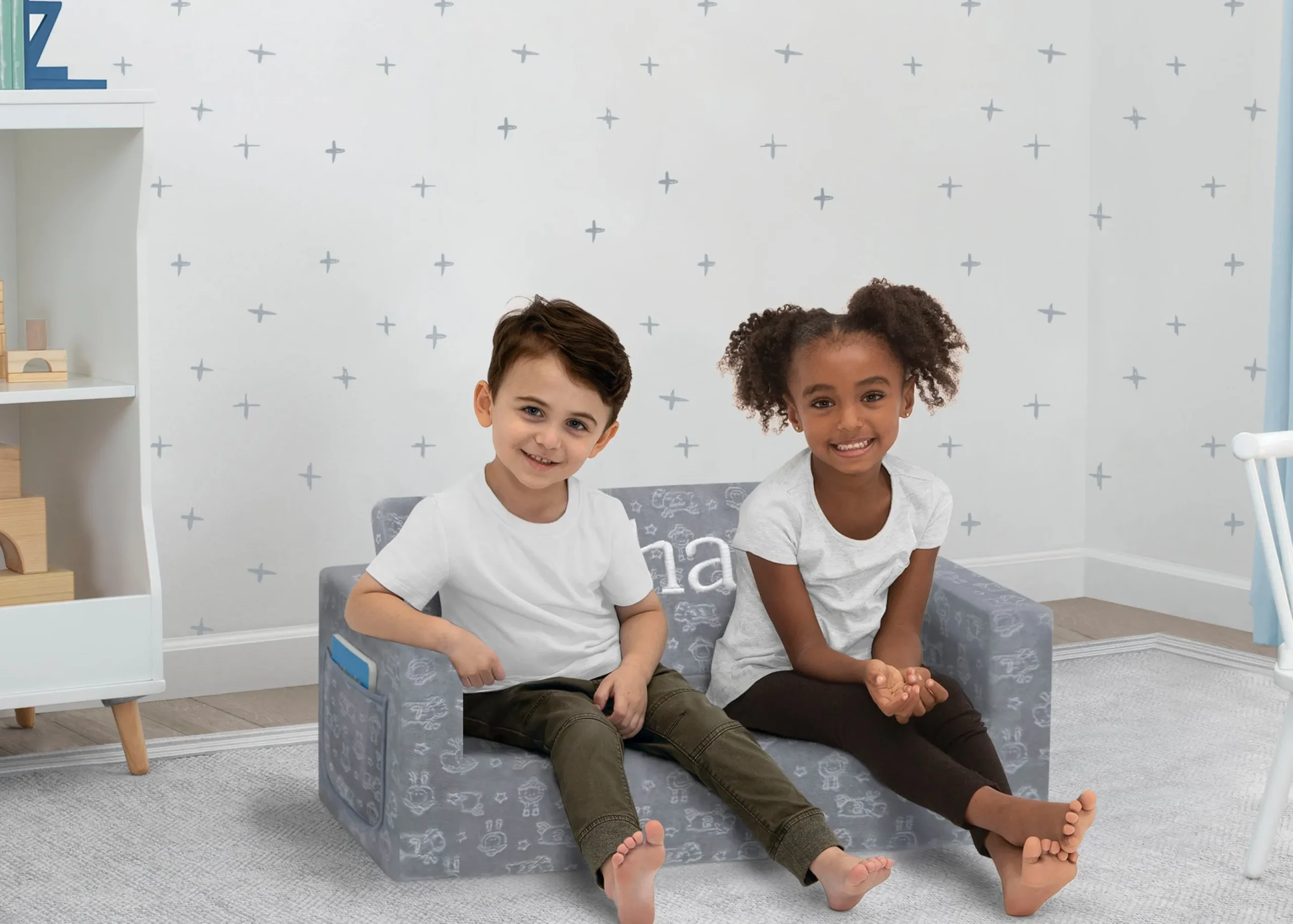 The Serta Perfect Sleeper Personalized Extra Wide Convertible Sofa to Lounger is a cozy chair by day, laid-back lounger by night. This convertible seat easily flips open to reveal multiple ways for your child to relax–they’ll love to sit and read or watch their favorite movies on the chair but when it’s time for a nap, this seat folds out into a comfy sleeper bed. Big enough to fit three small kids comfortably in sofa mode, it’s light enough to move around the house and is ideal for your children to share during playtime or sleepovers. The super-soft slipcover embossed with an adorable Serta sheep pattern features an easy-to-reach side pocket where your little one can keep their favorite books or tablet. The supportive foam construction will keep its shape and provides all-day comfort. Plus, the chair’s non-slip bottom ensures it stays in place. Personalize it with a name for the perfect finishing touch. Designed to ship in a super-small box, this lightweight foam kids’ sofa and lounger may take up to 24 hours to fully expand once unboxed. Machine-washable slipcover zips off for easy cleaning. Recommended for ages 18 months+. Available in Grey and Pink.