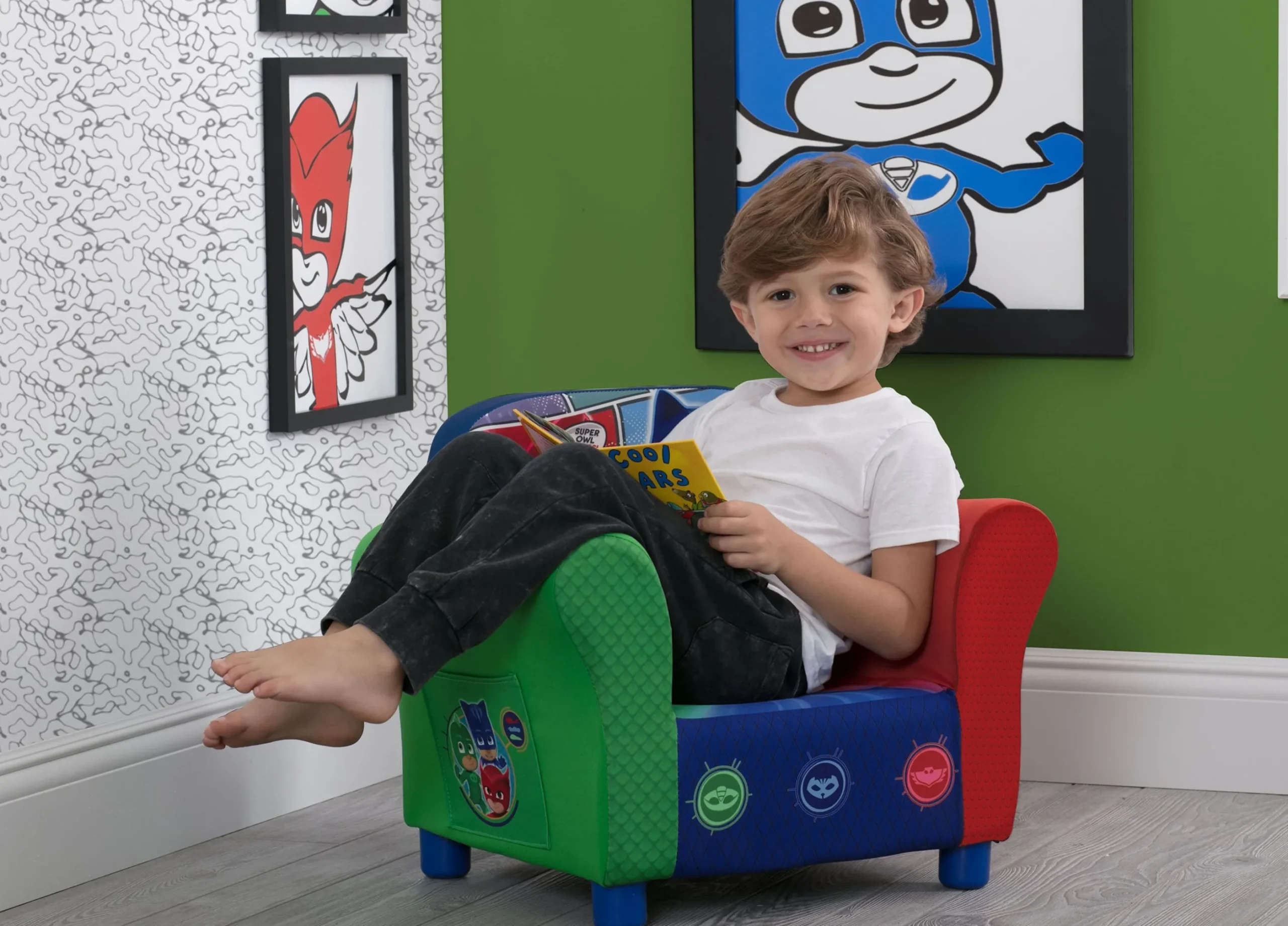 Ready to save the day, this PJ Masks Upholstered Chair is a great place to rest after a busy night solving mysteries and eradicating mayhem. Covered in colorful graphics of your child’s favorite heroes this sturdy chair is perfectly sized for your growing toddler.