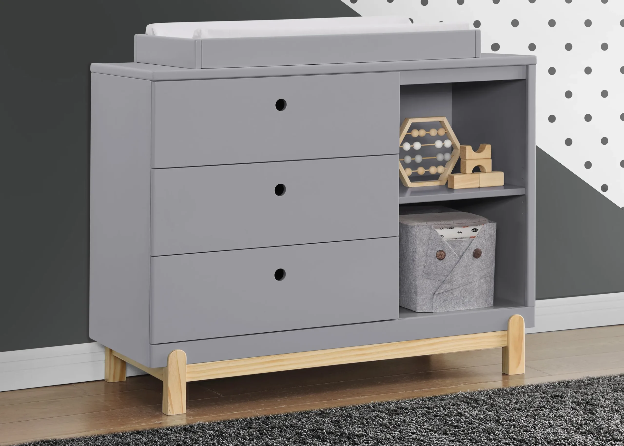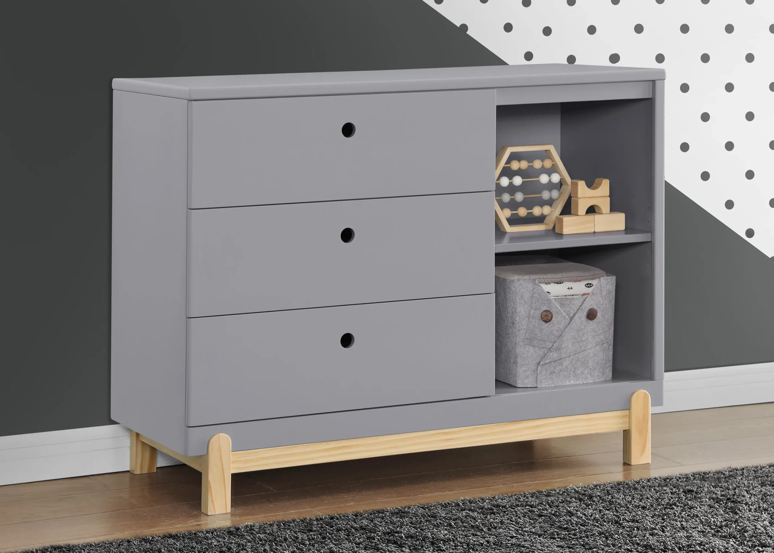 Bring style and convenient storage to your little one’s bedroom with the Poppy 3 Drawer Dresser with Cubbies by Delta Children. This wood dresser features three drawers to keep shirts, pants and socks, while the other side features two open cubbies to house books, bins or toys. Modern and playful, this versatile dresser features a natural wood base and feet paired with a contrasting finish on top for a look that works from baby to big-kid. To complete your child’s bedroom, pair the Poppy 3 Drawer Dresser with Cubbies with the Poppy 4-in-1 Convertible Crib by Delta Children. Dresser is available in Bianca White with Natural, Grey with Natural and Midnight Grey with Natural.