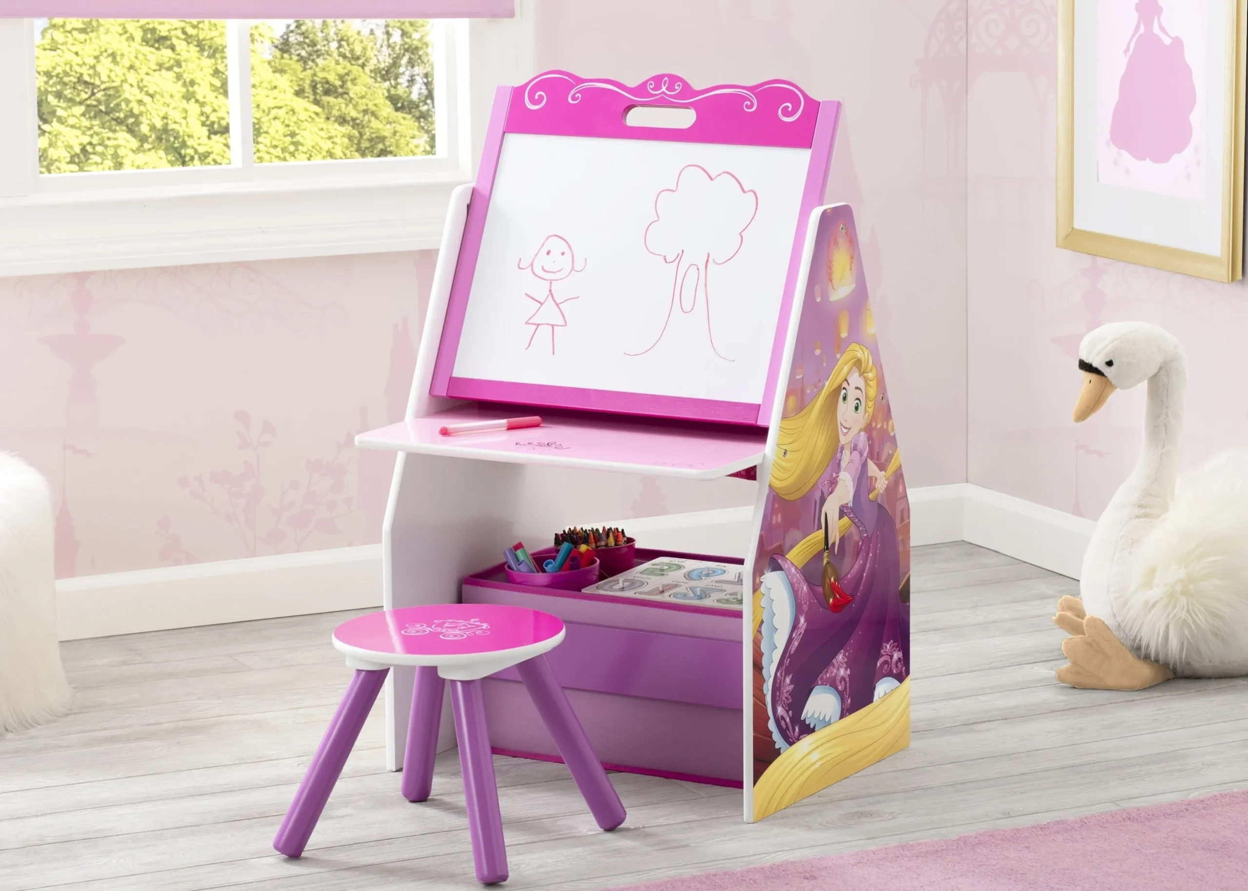 Time to get crafty! Designed to help your little one express their creative side, the Disney Princess Activity Center from Delta Children provides the space and storage your budding artist needs. The 3-in-1 design features a magnetic dry-erase board that can be positioned for your child to sit and draw with markers, or stowed upright to reveal a spacious tabletop to complete craft projects. On the other side of the easel a fabric toy bin and two tiers of storage pockets offers convenient compartments for art supplies, toys and books. Adorned with colorful graphics of girls’ favorite princesses, Belle, Ariel and Rapunzel, this Activity Center makes everyday endeavors more inspiring.