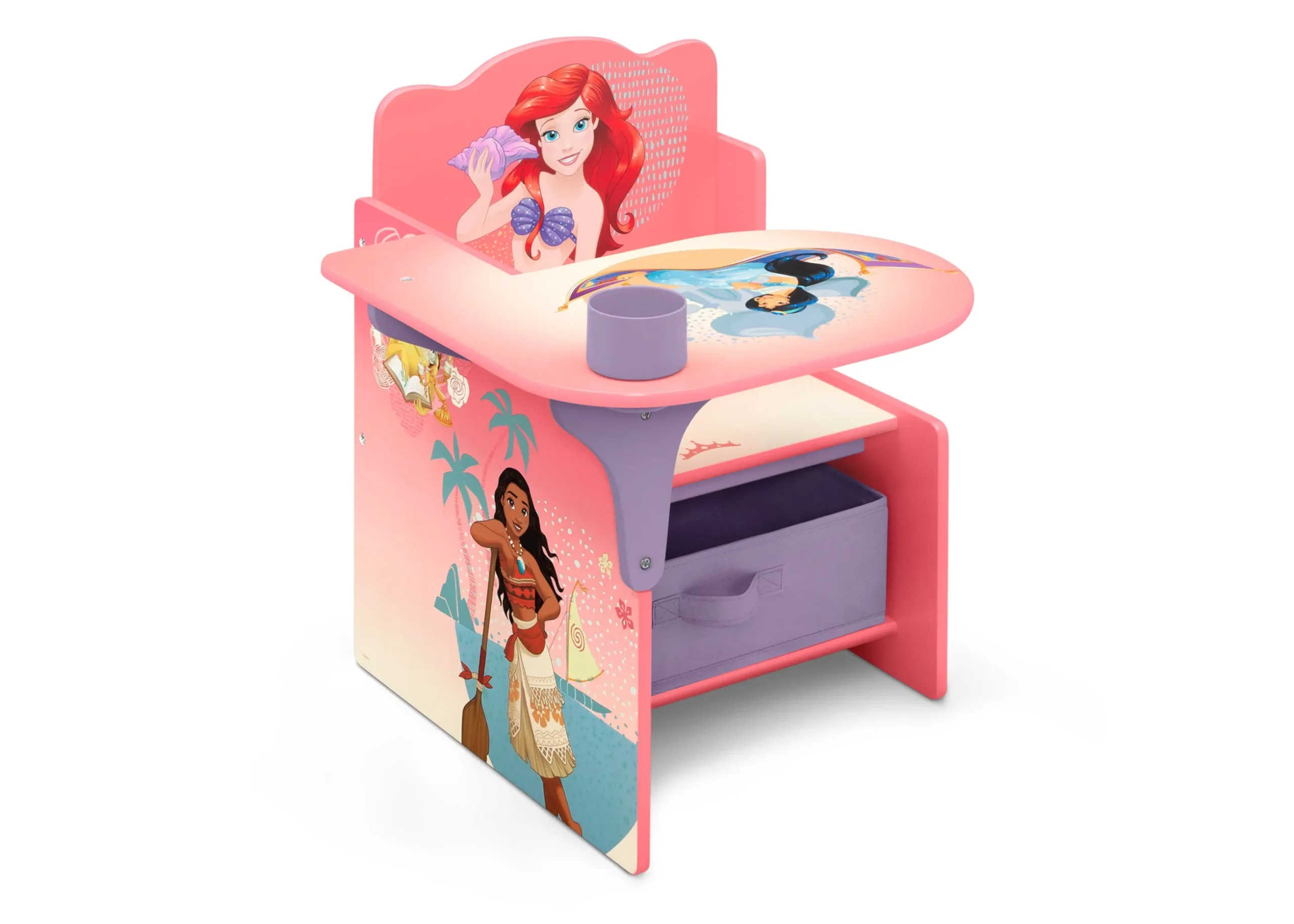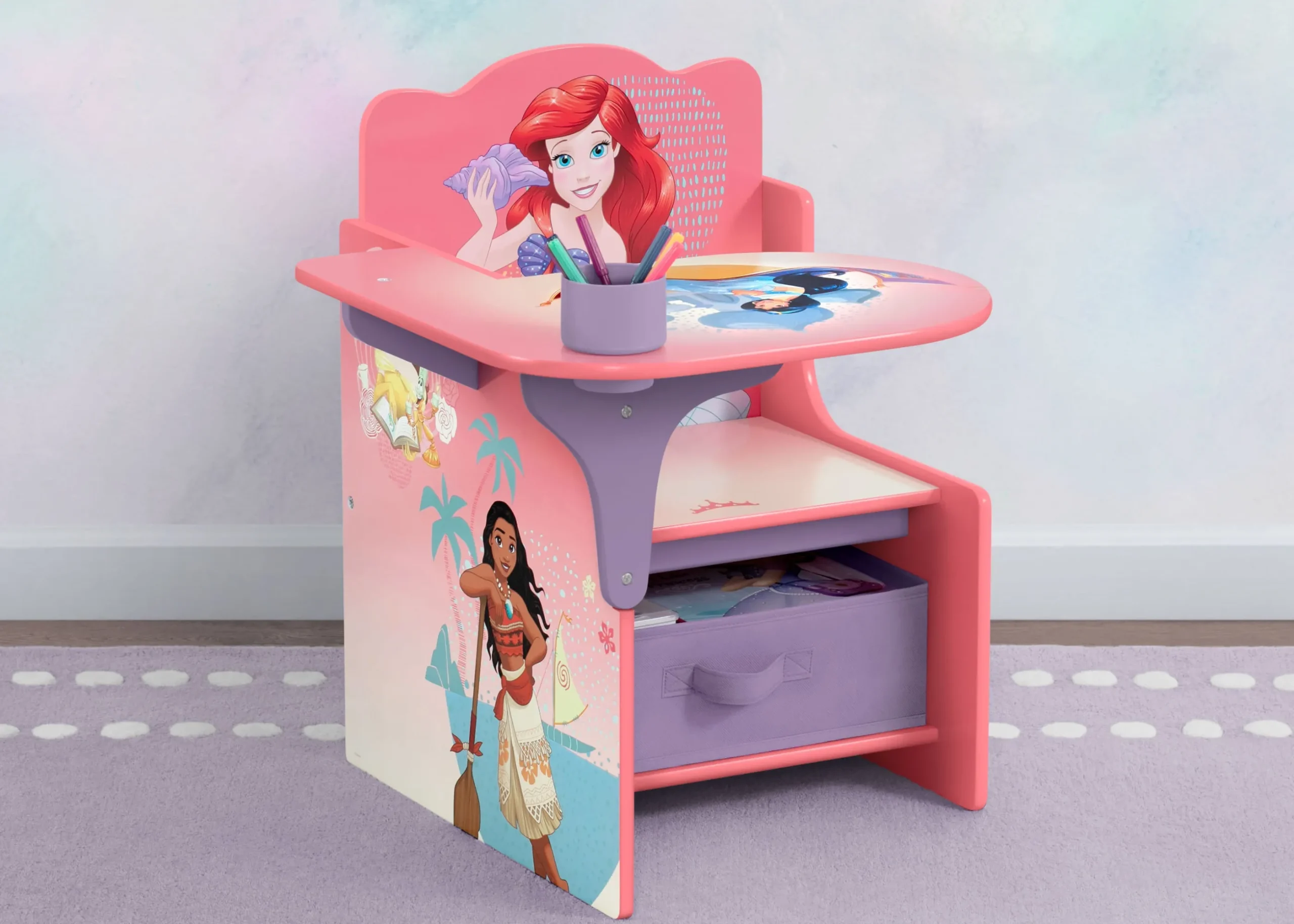 This Disney Princess Chair Desk with Storage Bin by Delta Children offers kids the perfect spot for snack time, crafts, playtime or homework. This smart and sturdy chair with colorful graphics of Ariel, Jasmine, Belle, Moana and Rapunzel also features a built-in cup holder to hold markers, plus a fabric storage bin underneath for additional art supplies or toys. Perfectly sized, this durable chair and desk combo has a large work surface and low height that makes it easy for preschool kids and toddlers to get in and out on their own.