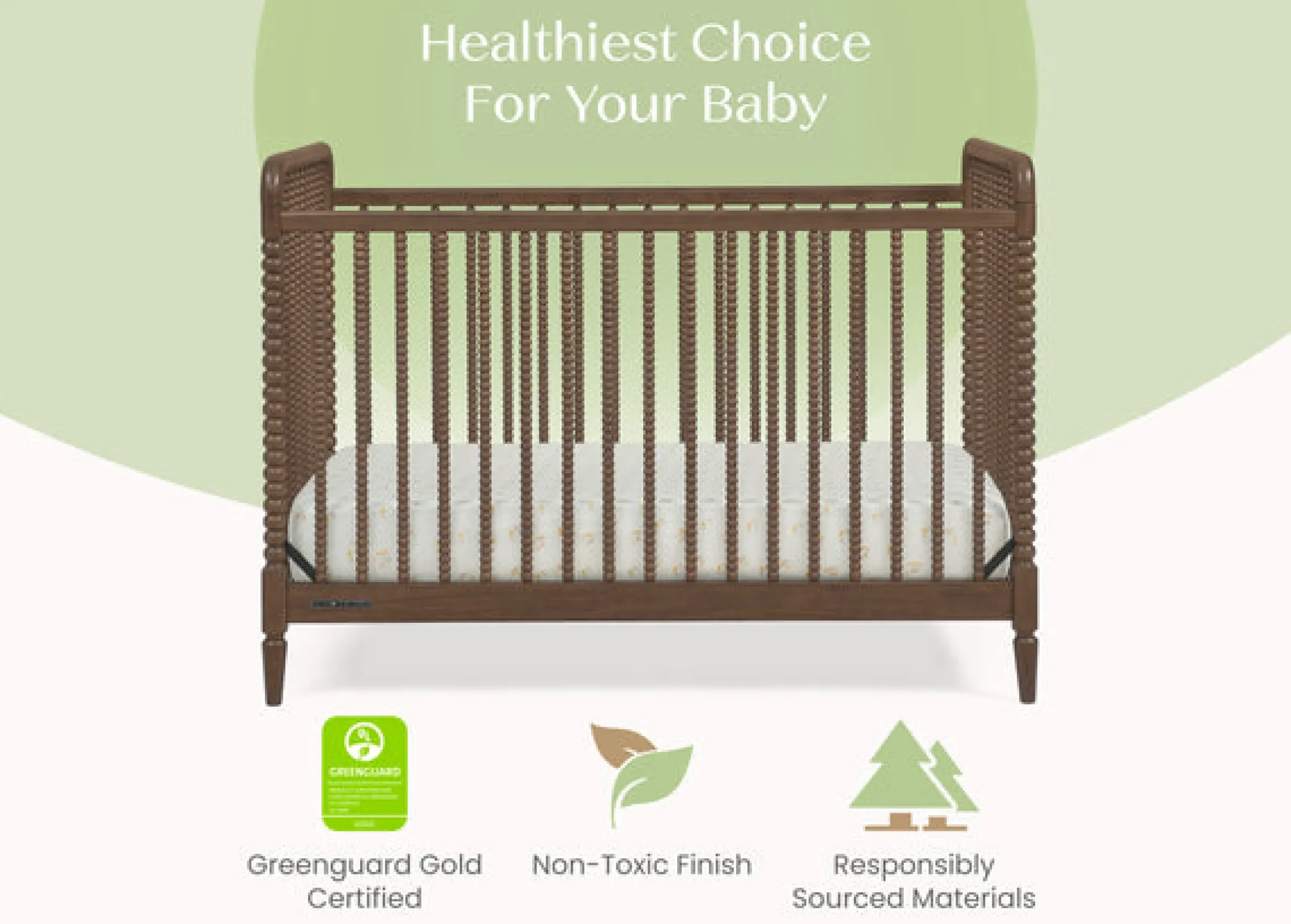 This crib meets or exceeds the most stringent chemical emissions standards to create a healthier home for your baby. It has been screened for more than 10,000 chemicals and VOCs that are known to pollute indoor air, certifying it contributes to cleaner indoor air. When you buy this crib, you can feel good about what you’re putting in your child’s nursery