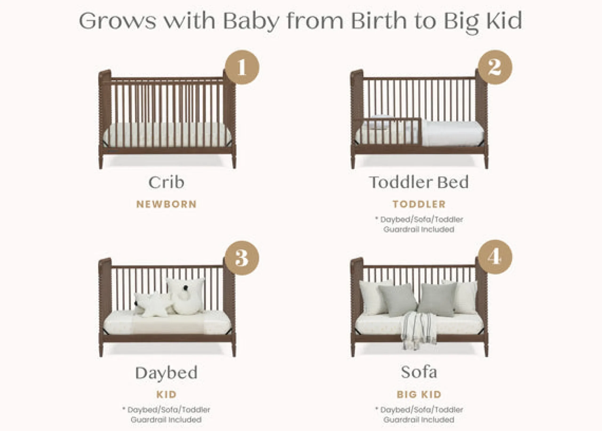 The Saint 4-in-1 Convertible Crib converts into a toddler bed, daybed and sofa (Daybed/Sofa/Toddler Guardrail included)