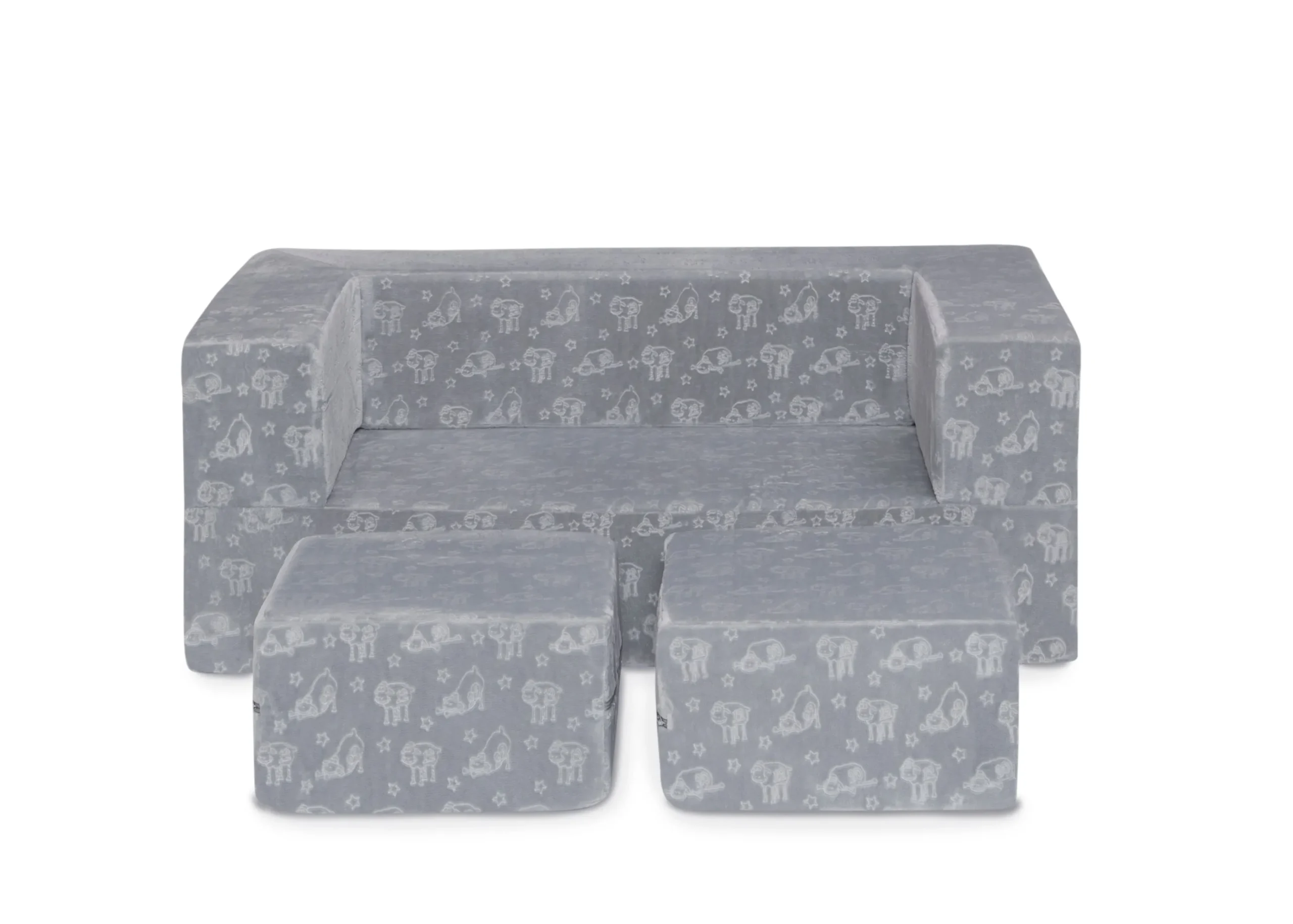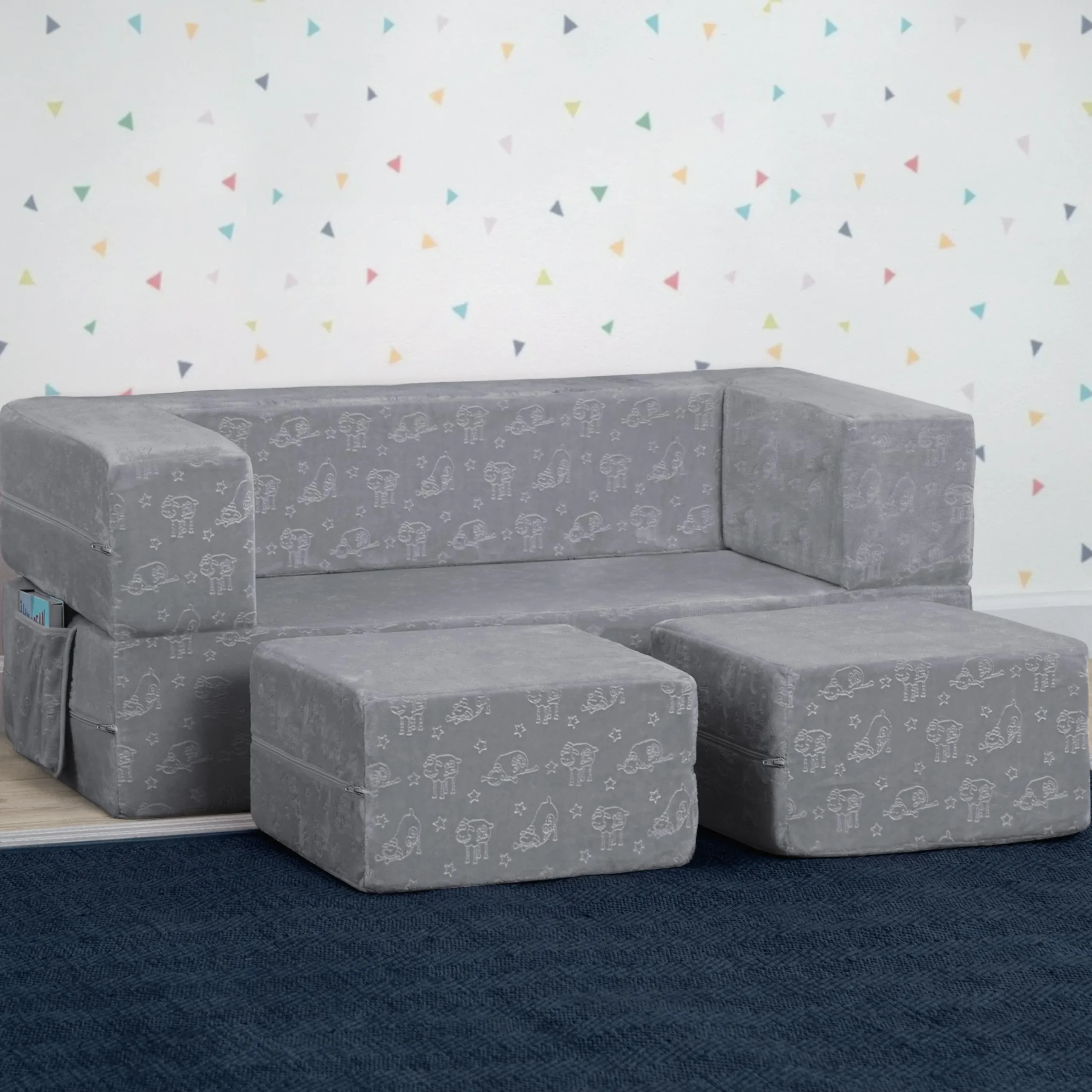 It’s a sofa! It’s a play mat! It’s a fort! The Serta Perfect Sleeper Convertible Foam Sofa and Play Set can be whatever your child imagines. The sofa’s convertible design with two included ottomans allows your little one to use it in so many ways. Use it as a sofa to watch TV, flip it open to use as a play mat or move the parts to configure a puppet theater, castle, ball pit or obstacle course. This modular play couch made up of three foam pieces will give kids hours of entertainment and encourage imaginative play while helping improve gross motor skills. The perfect addition to your child’s bedroom or playroom, the sofa’s sturdy foam base and velvety soft slipcover with a storage pocket and embossed Serta sheep print is a super-safe play structure. Slipcovers are removable and machine washable. Recommended for ages 18 months and up.