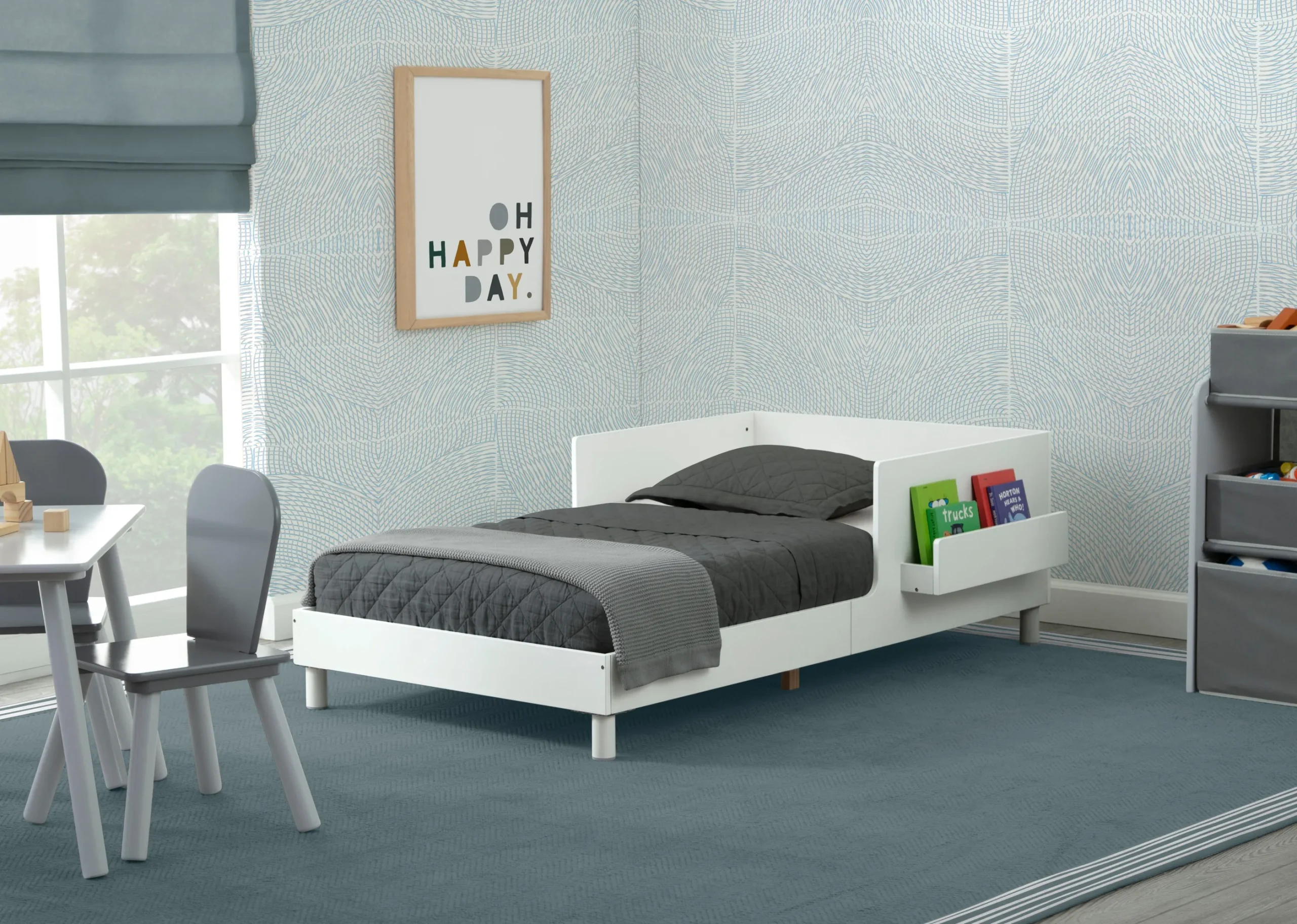 Create the coziest space with the Sleep N Store Toddler Bed by Delta Children. Its sleek details give your toddler’s bedroom an instant update, and its two attached guardrails and low height make it a safe choice for your growing child. The interchangeable bookshelf on one side offers kids essential storage and three cool options—choose from a rainbow shelf, dinosaur shelf or white shelf. Also included with this versatile toddler bed are permanent rainbow and dinosaur themed stickers that can be used to decorate the headboard. The perfect mix of style and storage, the Sleep N Store Toddler Bed by Delta Children is the ideal option for your little one. Mattress not included.