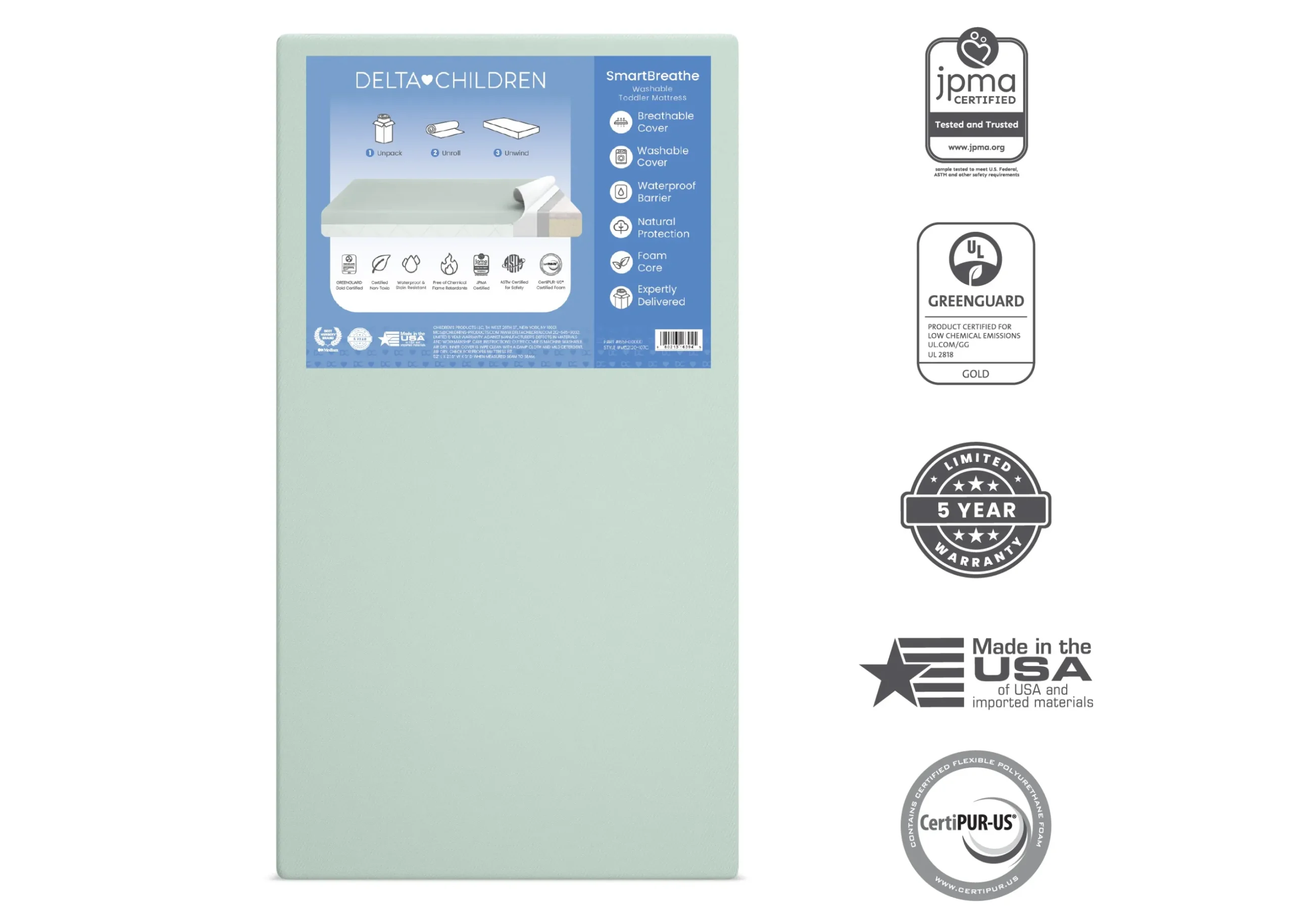 The Delta Children SmartBreathe Washable Toddler Mattress maximizes airflow and supports growing toddlers. It features a breathable knit cover that’s fully removable and machine washable for easy clean up. For additional protection, a waterproof barrier keeps the foam core dry and clean. A healthy and safe choice for your little one, this toddler mattress is GREENGUARD Gold certified and made with CertiPUR-US certified foam. Tested to meet or exceed the most stringent chemical emissions standards to create a healthier home for your child, it has been screened for more than 10,000 chemicals and VOCs that are known to pollute indoor air. Certified to contribute to cleaner indoor air, you can feel good about putting this mattress in your child’s bedroom. Compressed and shipped in an easy to manage box, all you need to do to set up this toddler mattress is unpack, unroll, and allow up to 48 hours for full expansion.