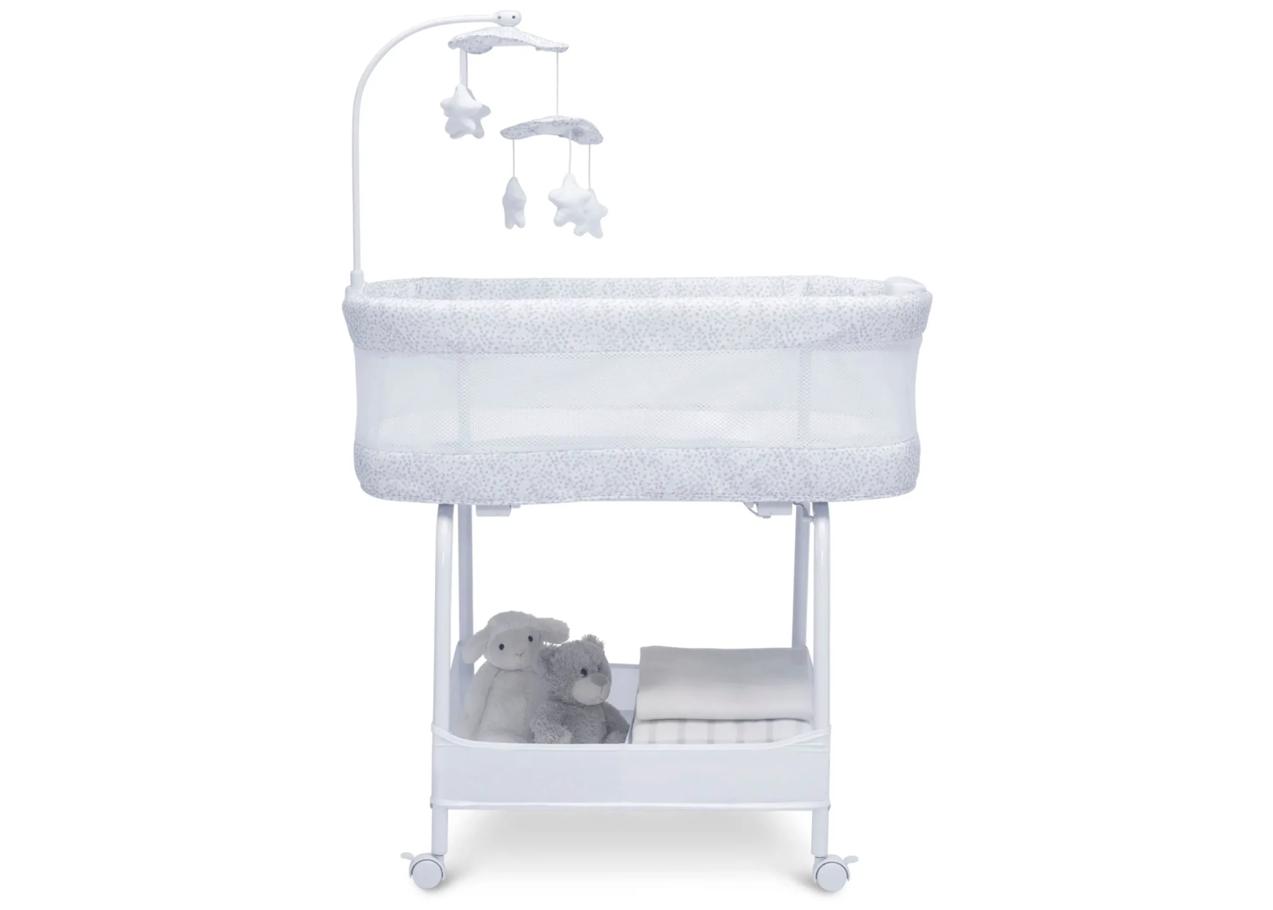 The Delta Children SmartSleep Auto Glide Bassinet with Bluetooth is a modern close-to-the bed sleeper that boasts state of the art technology. The Bluetooth enabled design easily pairs with the Delta Children Connect App, where you’ll be able to wirelessly control and customize the length and speed of the auto glide motion, sound level of the music and nature noises, as well as the brightness of the nightlight. Designed to help your baby fall asleep faster and stay asleep longer, the hands-free auto-glide motion will provide a calming environment while the two-tier toy arm with plush stars will engage and delight your baby if they wake up in the middle of the night. Breathable mesh sides all around provide increased airflow and a clear view of your sleeping baby. Other stand-out features include: large storage basket, comfortable 1-inch waterproof mattress pad with machine washable fitted sheet and wheels that make it easy to move around the house. Get the Delta Children SmartSleep Auto Glide Bassinet and help soothe baby back to sleep (without getting out of bed!). The Delta Children Connect App is free to download and available on the Apple App Store or on Google Play. This bassinet is recommended for babies 0-5 months. Max weight 30 lbs. Stop use at 5 months or once your infant begins to push up on their hands and knees, whichever comes first.