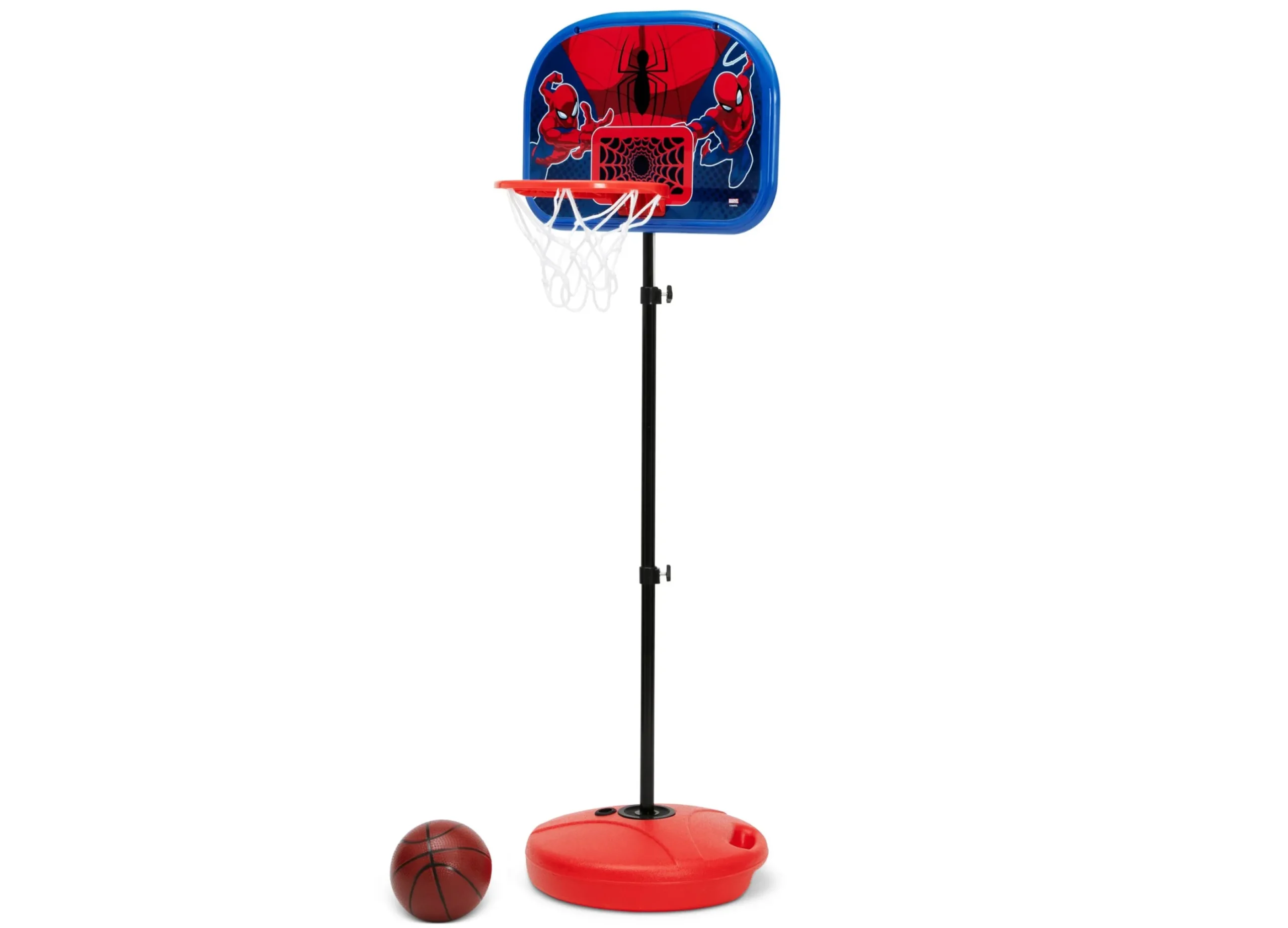 Score big points with the basketball fan in your life with this Spider-Man Basketball Hoop Set by Delta Children! The backboard features everyone’s favorite superhero, Spider-Man. It will help kids develop social, motor skills and coordination—they will work on their gross motor skills as they run and shoot the basketball and practice fine motor skills and hand-eye coordination as they try to control the basketball. The height can be adjusted to multiple settings between 4.2 and 5.25 feet to accommodate all ages and skill levels. Use inside or outside. Before play, add sand or water to the base for stability. Includes basketball and hand air pump.