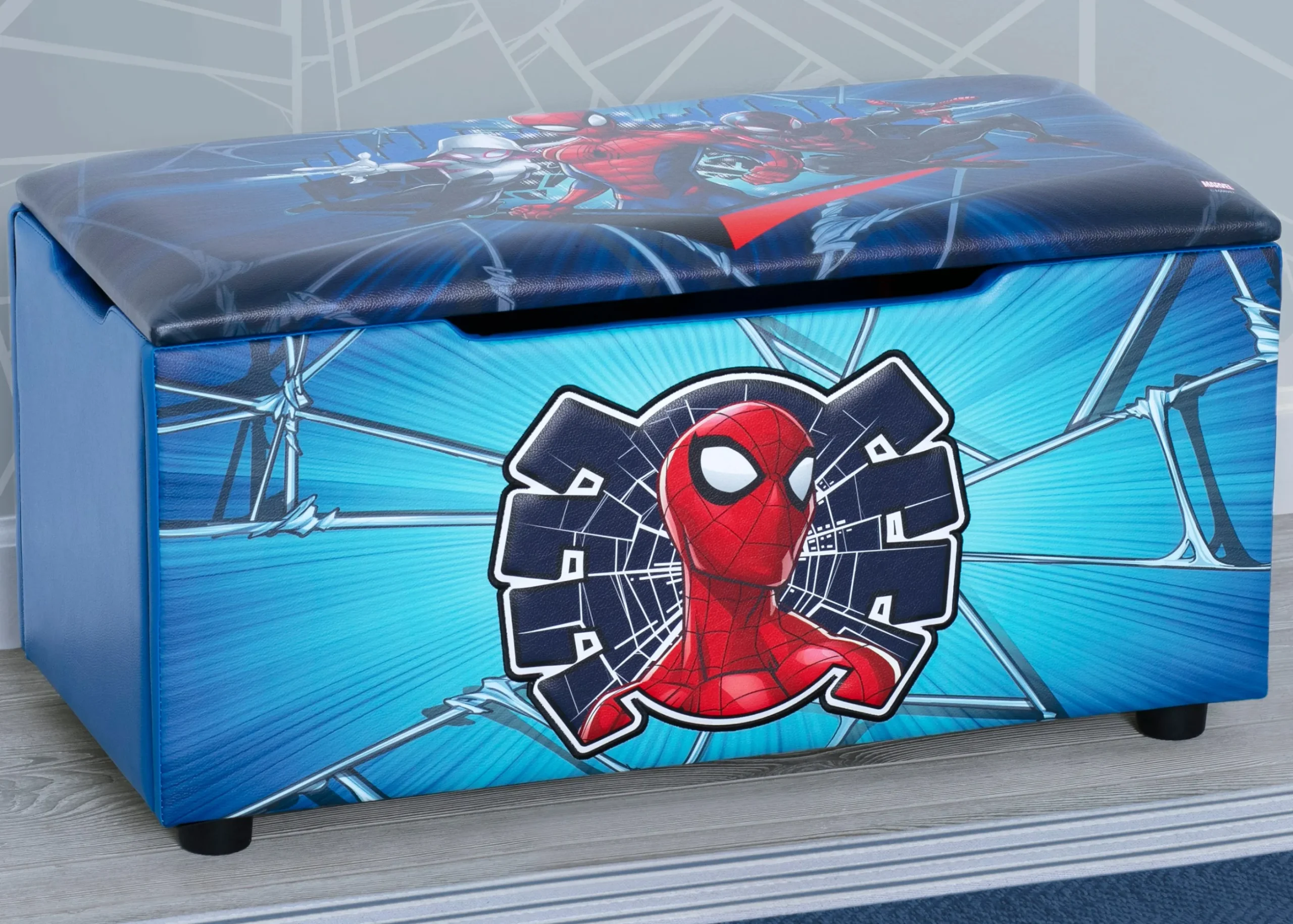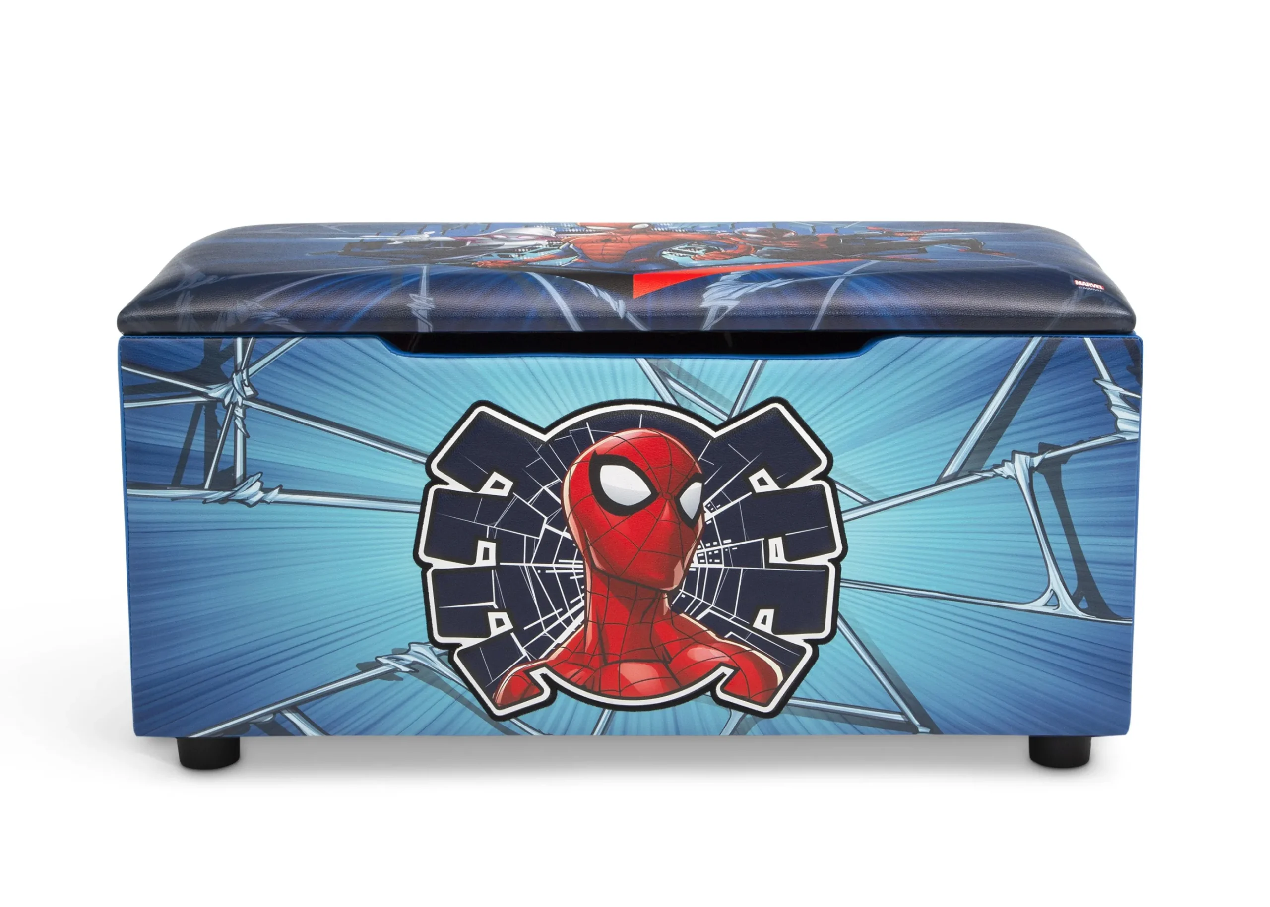 Your favorite web slinger will be on the cleanup job in the playroom, bedroom or living room with this Spider-Man Upholstered Toy Box/Bench with Lid by Delta Children. The bold, 3D appliqued details, durable wood frame and fully upholstered construction ensures it’s built to last. The spacious interior can fit toys, blankets, games and more! Thoroughly tested for safety, this toy box doubles as a bench that will be ideal at the foot of your child’s bed or anywhere else in the house an extra seat is needed. This toy box perfectly coordinates with other Spider-Man furniture and décor products from Delta Children.