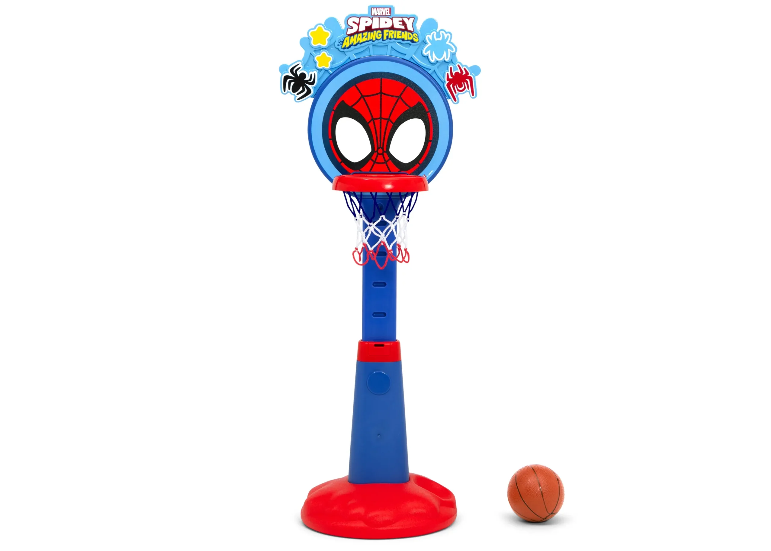 This Spidey and His Amazing Friends Plastic Basketball Set by Delta Childrenwill be a slam dunk with your little web slinger. A fun way to introduce kids to the game of basketball, iconic Spidey artwork on the backboard ensures there’s always a friendly face, no matter how competitive the game gets. It will help toddlers and preschoolers develop social, motor skills and coordination—kids will work on their gross motor skills as they run and shoot the basketball and practice fine motor skills and hand-eye coordination as they try to control the basketball. The height can be adjusted between 3.37 and 4.33feet to accommodate all ages and skill levels. Use inside or outside. Before play, add sand or water to the base for stability. Includes basketball and hand air pump.