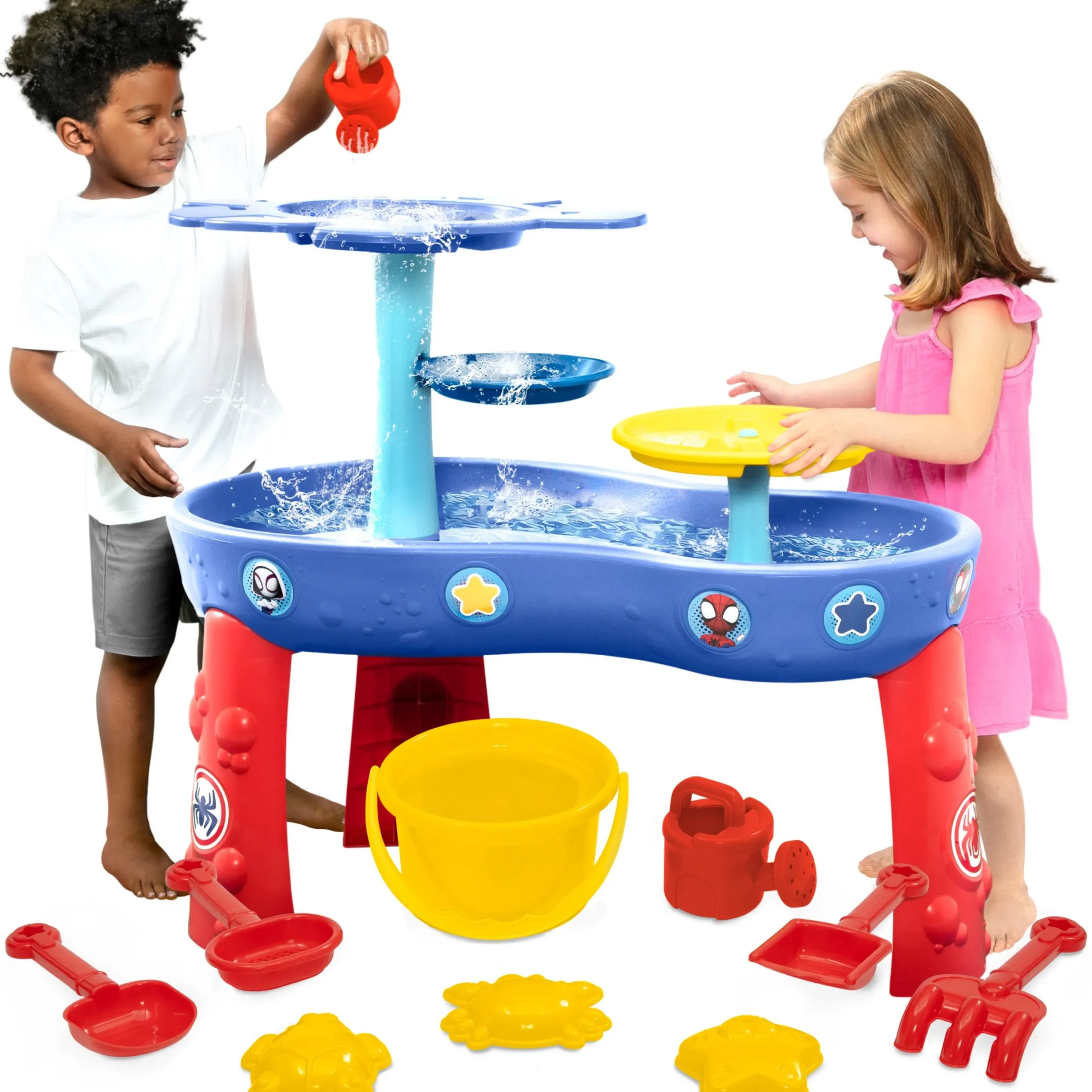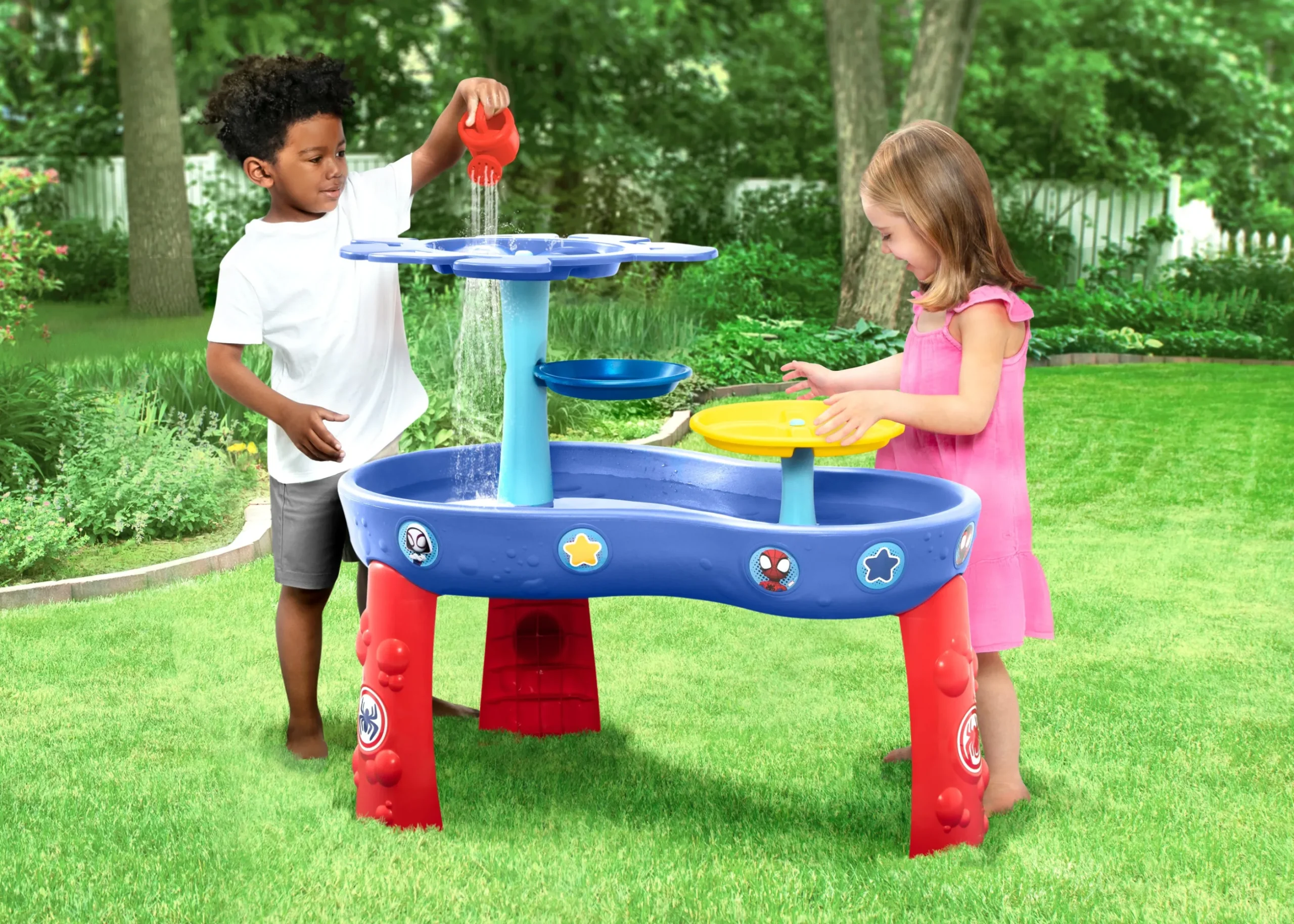 Kids will be amazed by the rotating Spidey waterfall feature and spinning waterfall discs. Colorful weather-resistant Spidey stickers decorate the water table