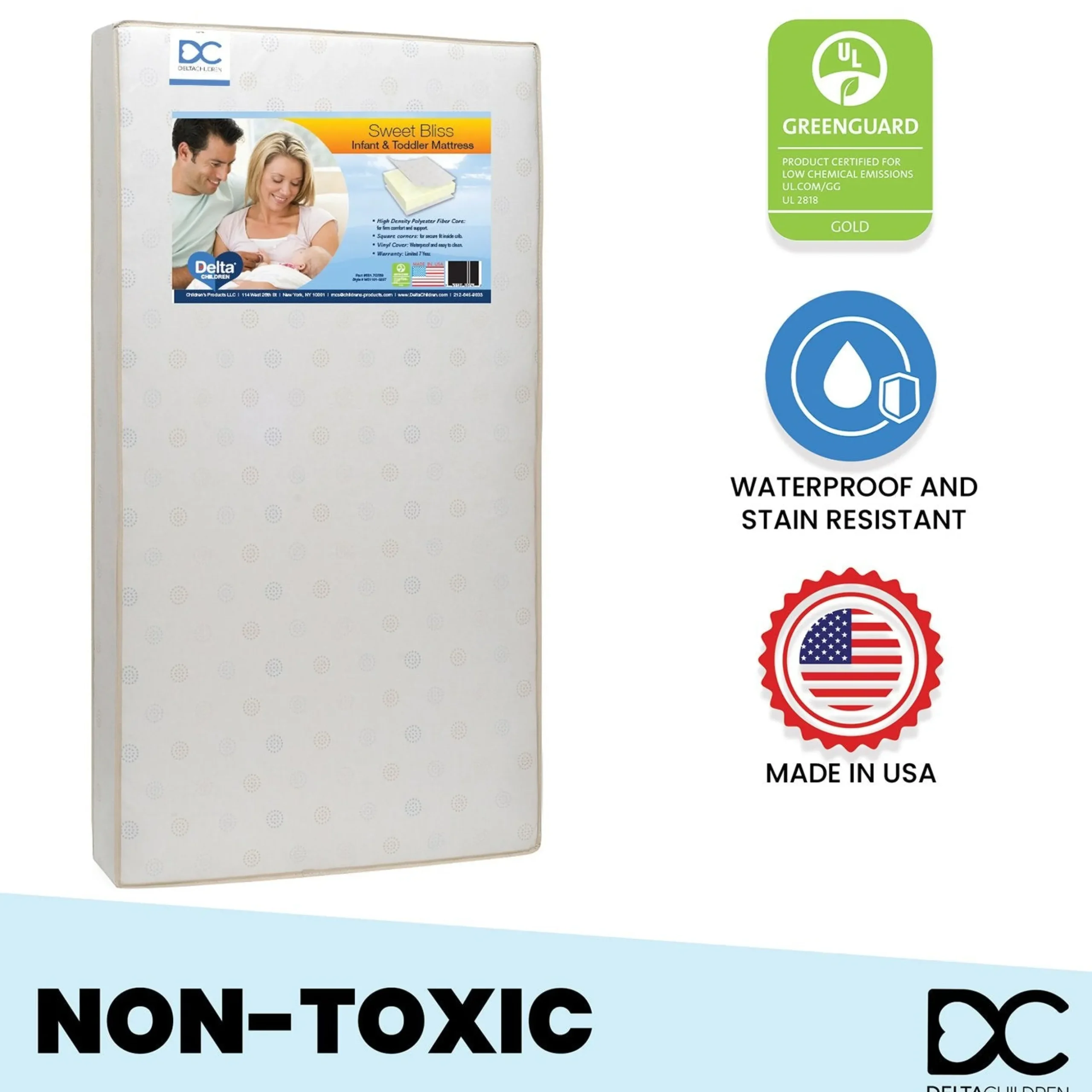 Delta Children’s Sweet Bliss Crib and Toddler Mattress offers your baby or toddler support and comfort at a great price. Built with a firm polyester fiber core made from recycled materials, this sturdy mattress is has a durable waterproof cover for easy cleanup. Finished with square corners to help create a secure fit inside a crib or toddler bed, the Sweet Bliss Crib and Toddler Mattress is the ideal choice for your growing child.