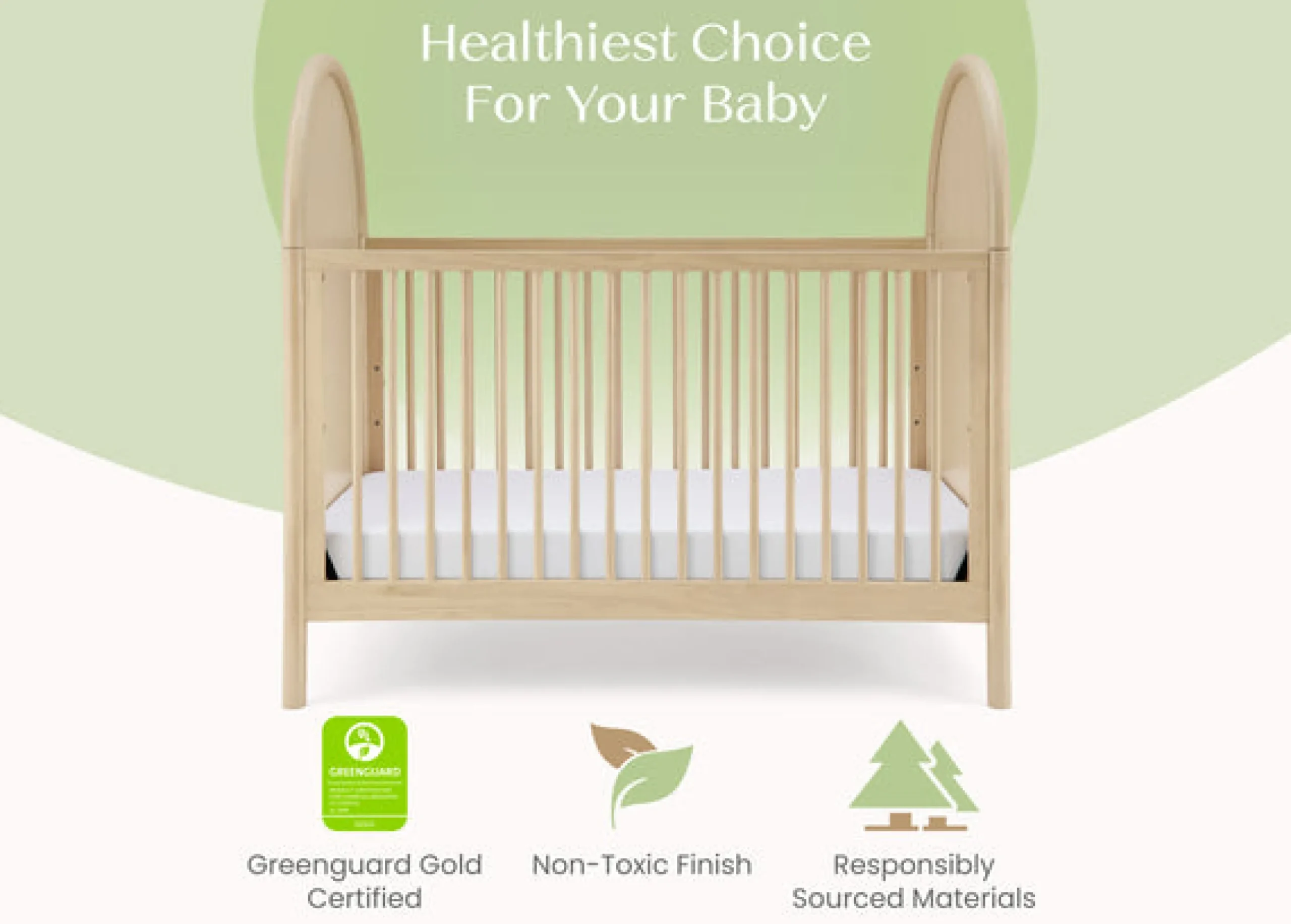 This crib meets or exceeds the most stringent chemical emissions standards to create a healthier home for your baby. It has been screened for more than 10,000 chemicals and VOCs that are known to pollute indoor air, certifying it contributes to cleaner indoor air. When you buy this crib, you can feel good about what you’re putting in your child’s nursery