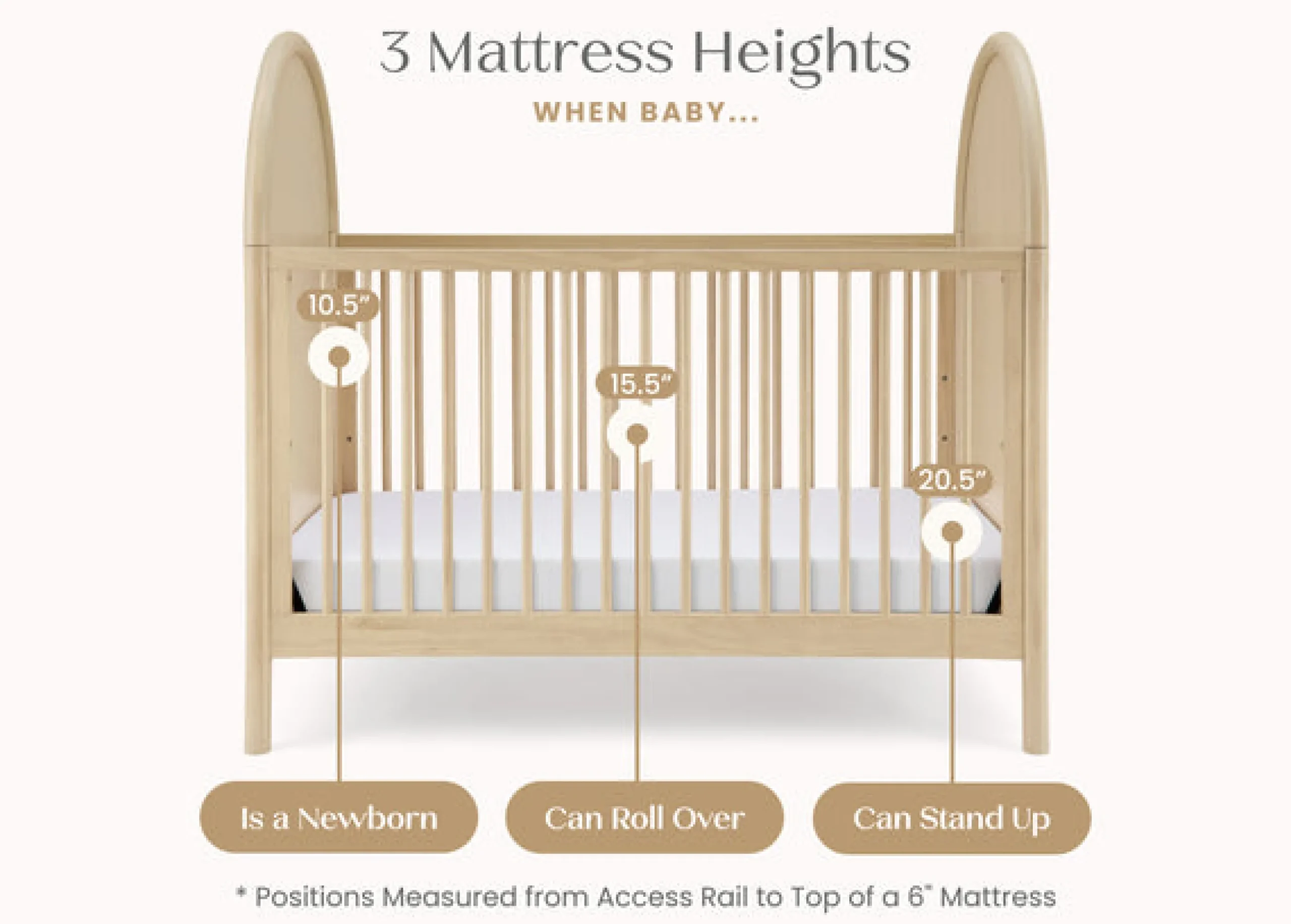 - Adjustable height mattress support with 3 convenient positions to grow with your baby