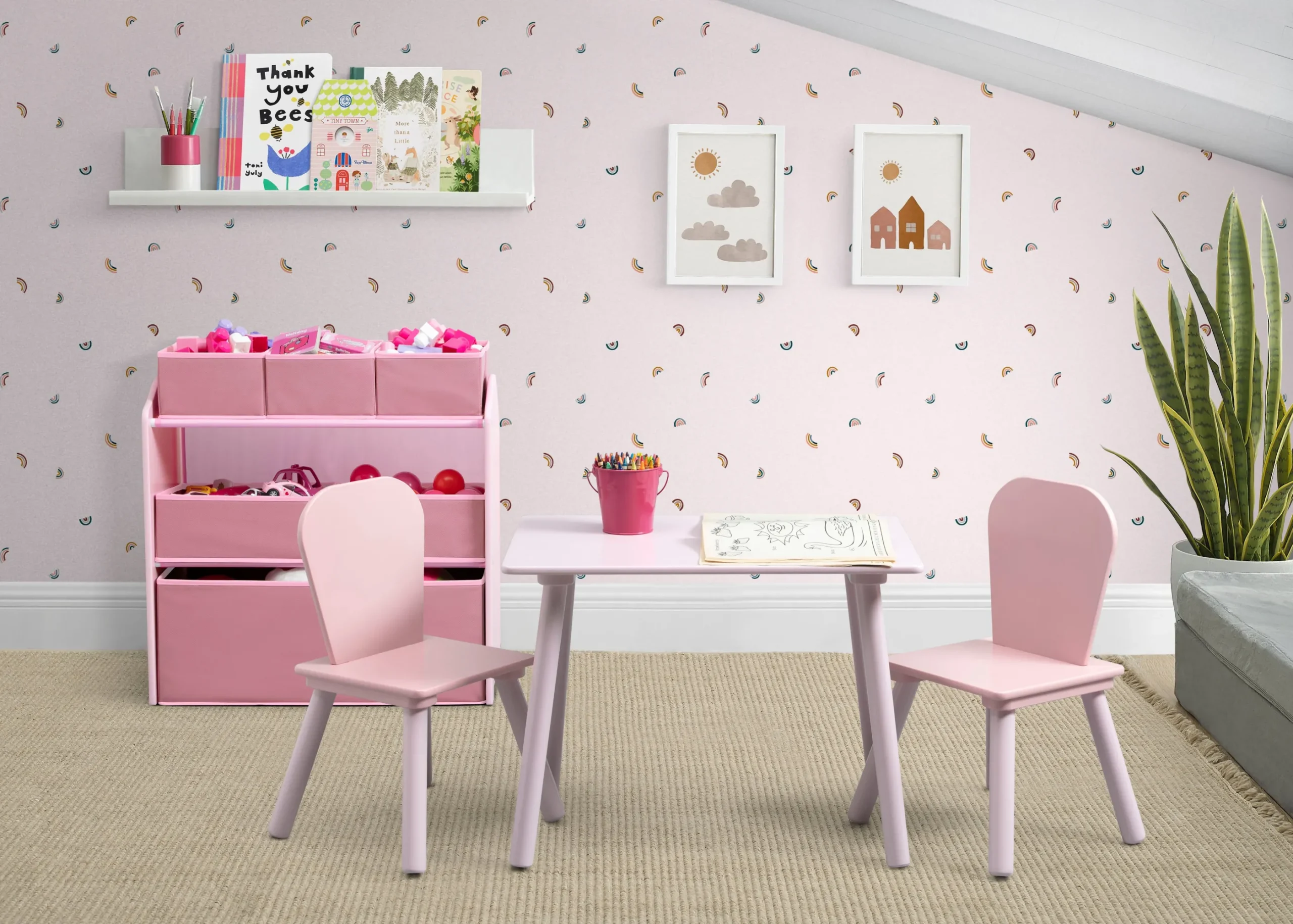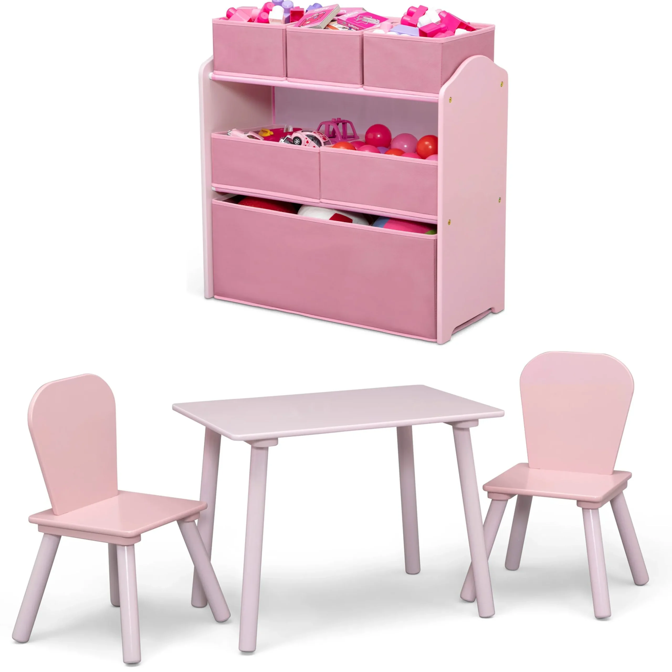 Complete your child’s playroom or bedroom with this 4-Piece Toddler Playroom Set by Delta Children. Vibrant and playful, this set includes a wooden play table, two coordinating chairs and a toy organizer. Also included in this set, a set of reusable vinyl cling stickers that kids will love arranging to the sides of the toy organizer to create a new story every time they play. All items are at the perfect kid-sized height to help teach your little one responsibility and independence as they play, eat and clean up on their own. The adorable two-tone design ensures your little one’s playroom is a stylish and charming as the rest of your home. Ideal for both boys and girls, this kids’ playroom set comes in two colors, Grey/White and Pink/White. Get it today–the play possibilities are endless with this versatile set! Recommended for ages 3+.
