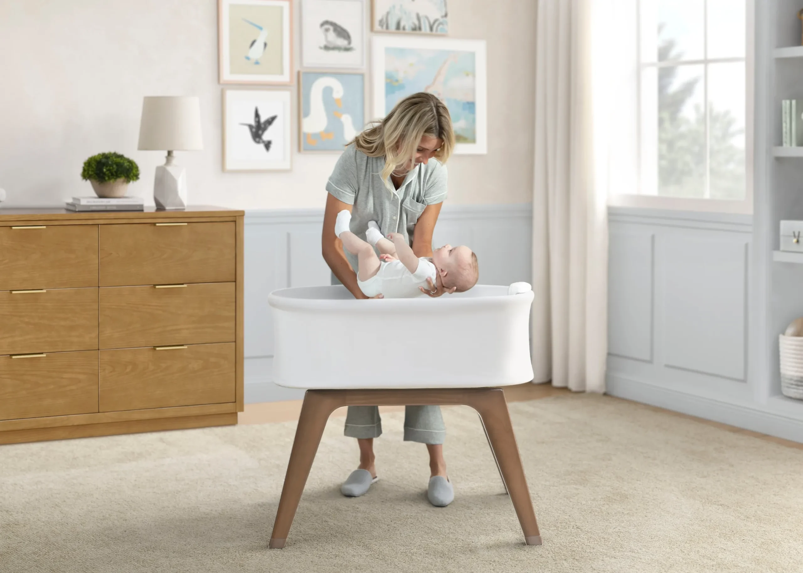 The Delta Children Aero Smart Auto Glide Bassinet hears your baby’s cries and automatically responds with advanced cry detection technology that activates a soothing side-to-side gliding motion, lullabies or sounds, and calming amber light that supports healthy sleep patterns and prevents overstimulation. Customize your baby’s ideal sleep environment with over 1,200 setting combinations that you can control directly in the Delta Children Connect App. Parents can also stream any song via Bluetooth wireless technology. The patent-pending magnetic auto-glide feature offers the quietest and most reliable glide motion on the market, beating out the competition that still uses nosey motors. A breathable knit interior, stain-resistant, 100% organic, GOTS Certified fabric exterior, included PureAir Fitted Sheet, Jersey knit fitted sheet and water-resistant mattress pad help create a safe and serene space for your baby. Its sleek aesthetic and FSC-certified wood legs that help support healthy forests and ecosystems, seamlessly fits with your home’s decor. This bassinet is recommended for babies 0-5 months. Max weight 30 lbs. Stop use at 5 months or once your infant begins to push up on their hands and knees, whichever comes first.