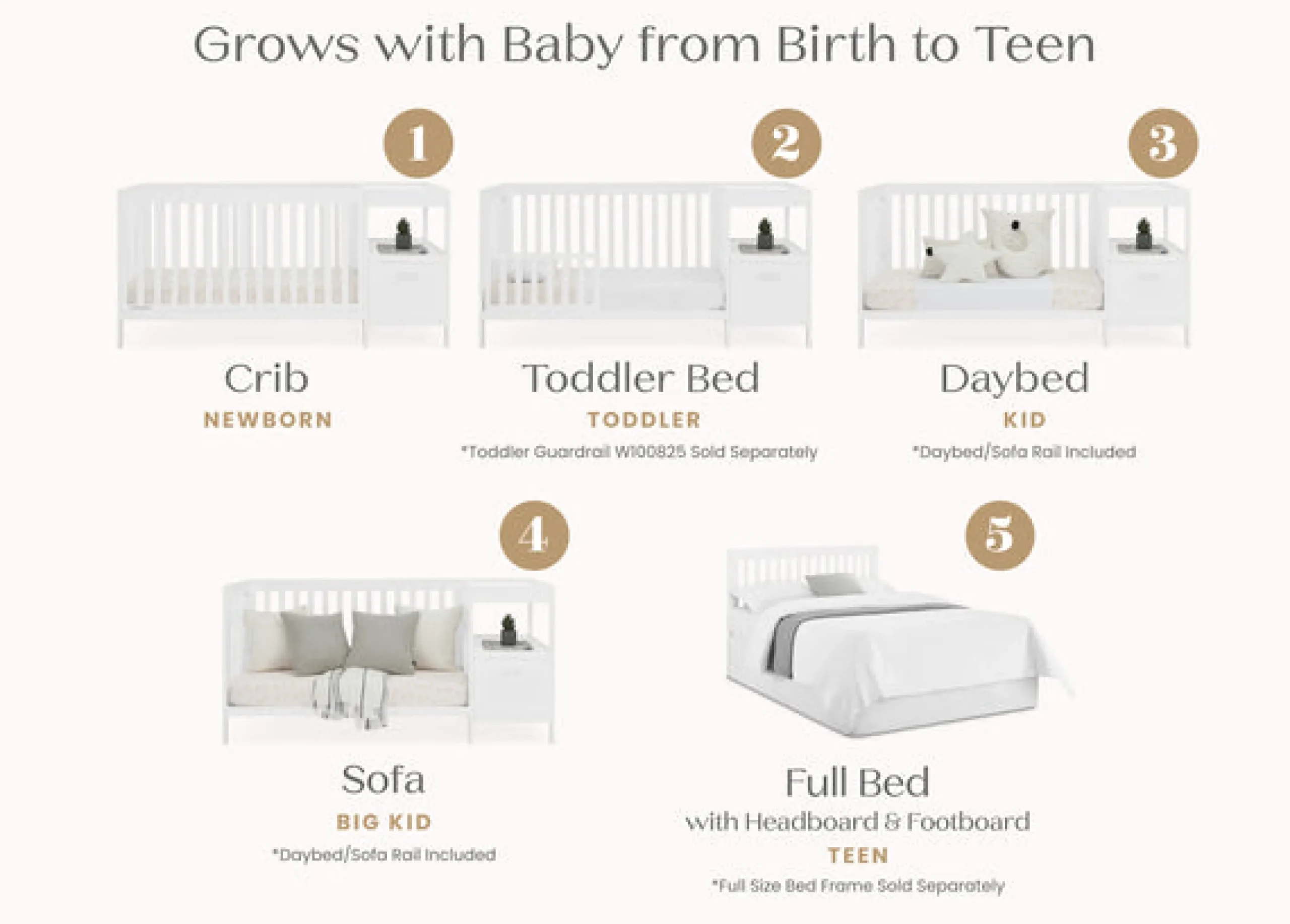 Designed to grow with your baby throughout life’s multiple stages, this crib converts to toddler bed, daybed, sofa and full-size bed (Daybed Rail included; Toddler Guardrail #W100825 and standard full size metal bed frame sold separately)