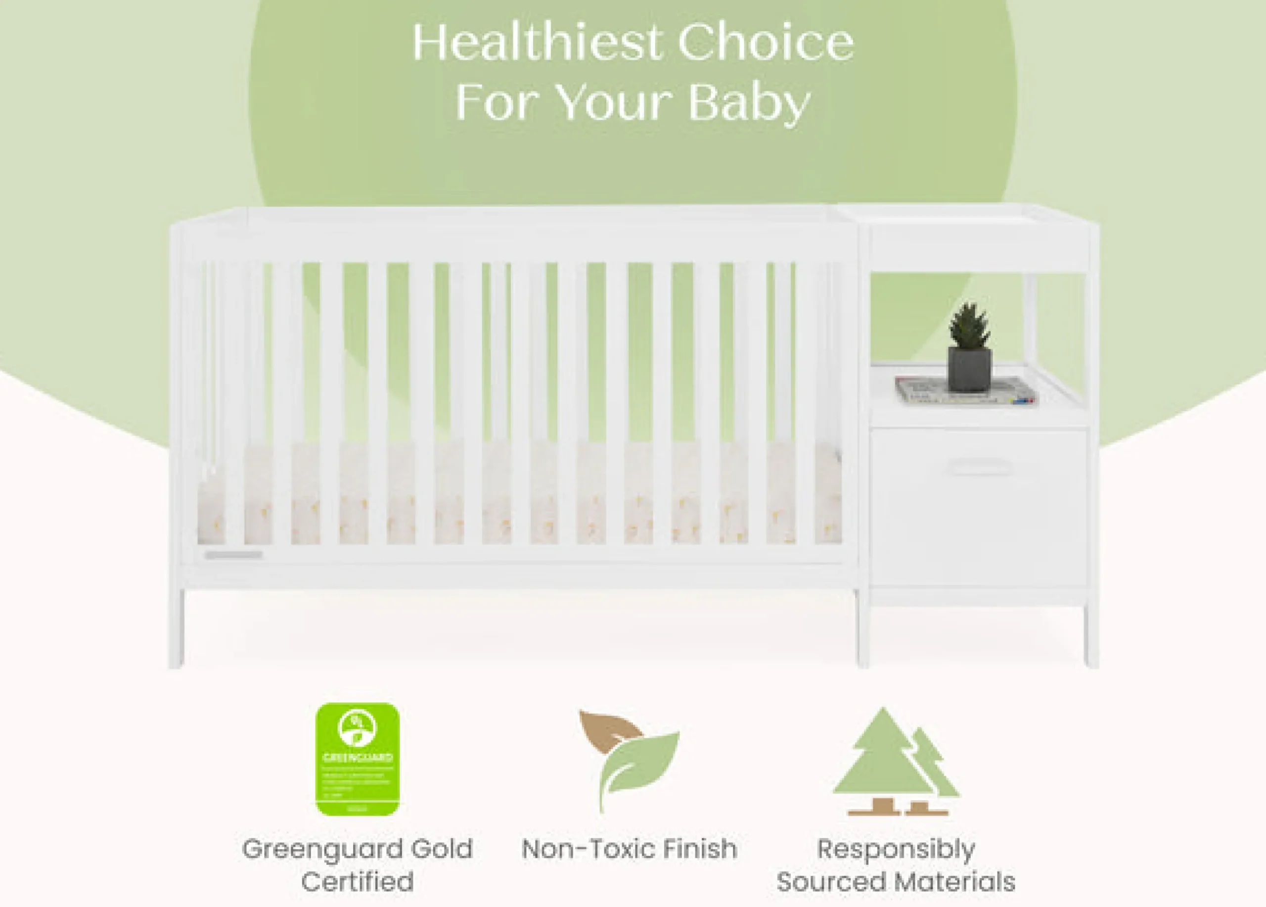 This crib meets or exceeds the most stringent chemical emissions standards to create a healthier home for your baby. It has been screened for more than 10,000 chemicals and VOCs that are known to pollute indoor air, certifying it contributes to cleaner indoor air. When you buy this crib, you can feel good about what you’re putting in your child’s nursery