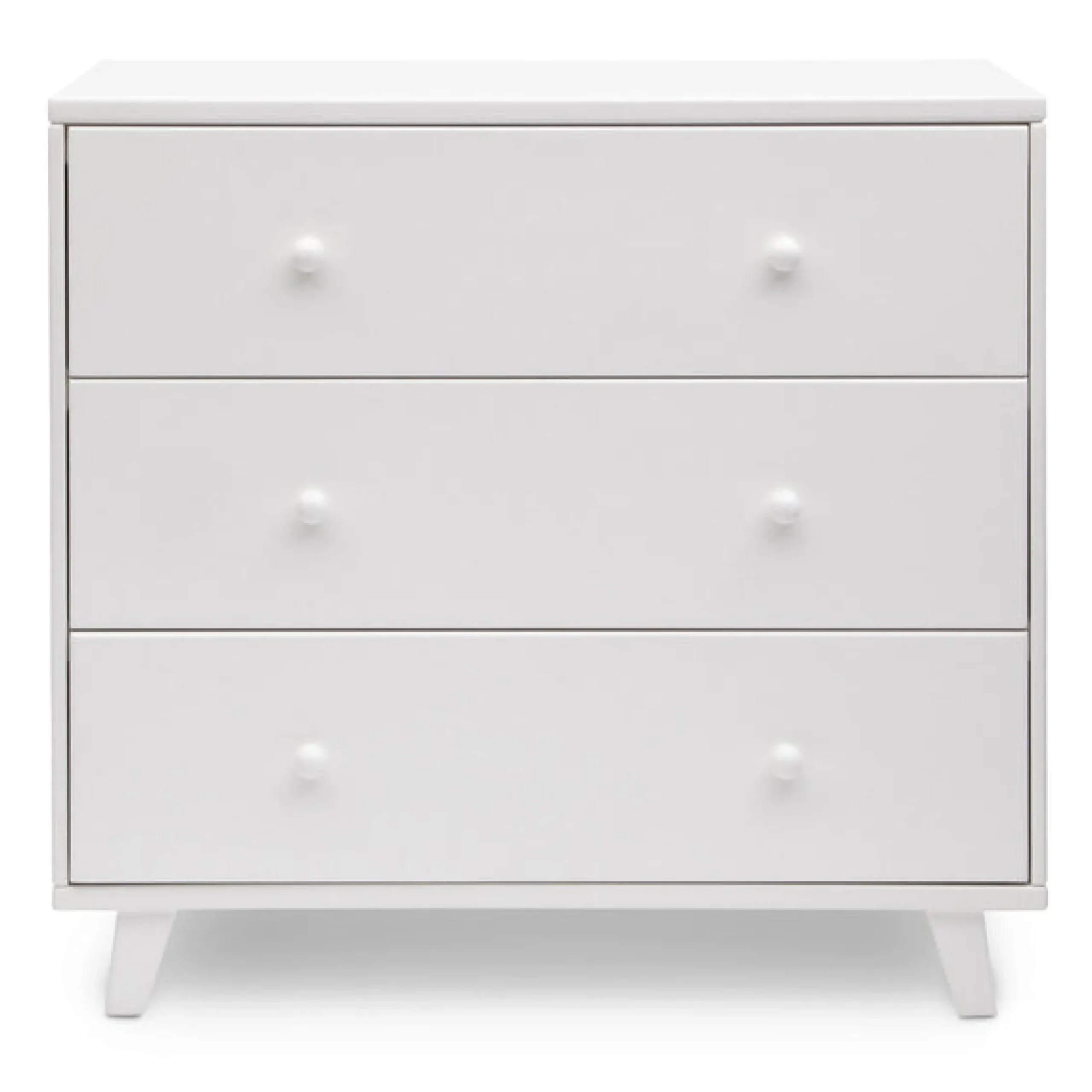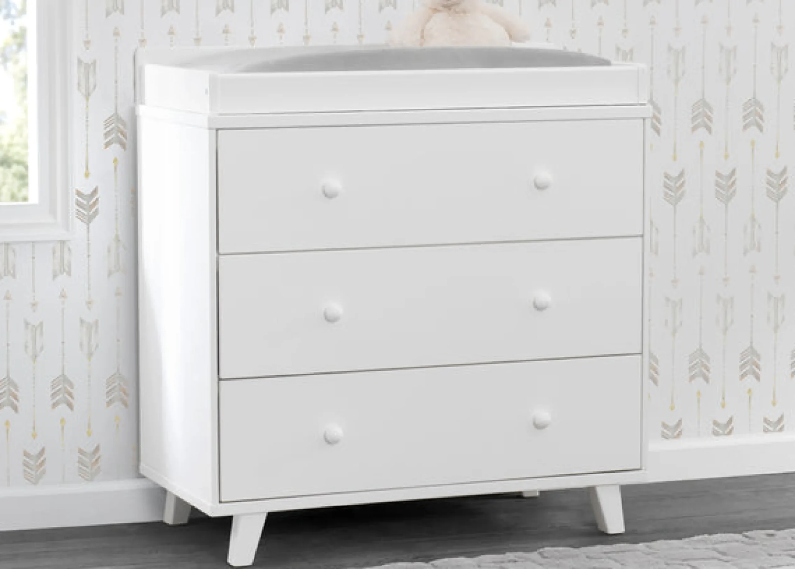 A modern heirloom, the Ava 3 Drawer Dresser with Changing Top and Interlocking Drawers by Delta Children features clean, crisp lines and three spacious drawers with plenty of storage for your growing baby. Topped with a removable changing top, the dresser does double duty–once your baby outgrows the need for a changing table, just remove the topper for many additional years of use. Outfitted with an interlocking drawer system that limits the number of drawers that can be opened at one time for your child’s safety, this dresser is the best option for your little one. Plus, its legs match Delta Children’s Ava 3-in-1 Convertible Crib, pair them together to create a cohesive nursery, or mix it with furniture in the same finish or contrasting finish for a more eclectic look. Plus, it’s GREENGUARD Gold Certified, which means it’s built to contribute to cleaner air for a healthy home.This Delta Children dresser is tested to meet the current requirements of ASTM F2057, the mandatory CPSC safety standard that protects young children from furniture tip-over incidents. For your children’s safety, only purchase dressers that comply with this standard. For additional security, Delta Children strongly recommends that all dressers in your home be anchored; all Delta dressers include a wall anchor. To learn how to properly secure your dresser, please see the product assembly instructions or visit our website.