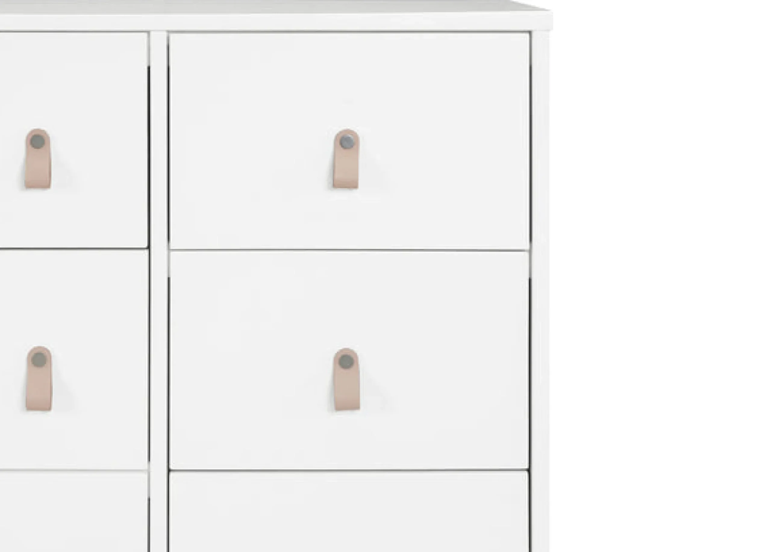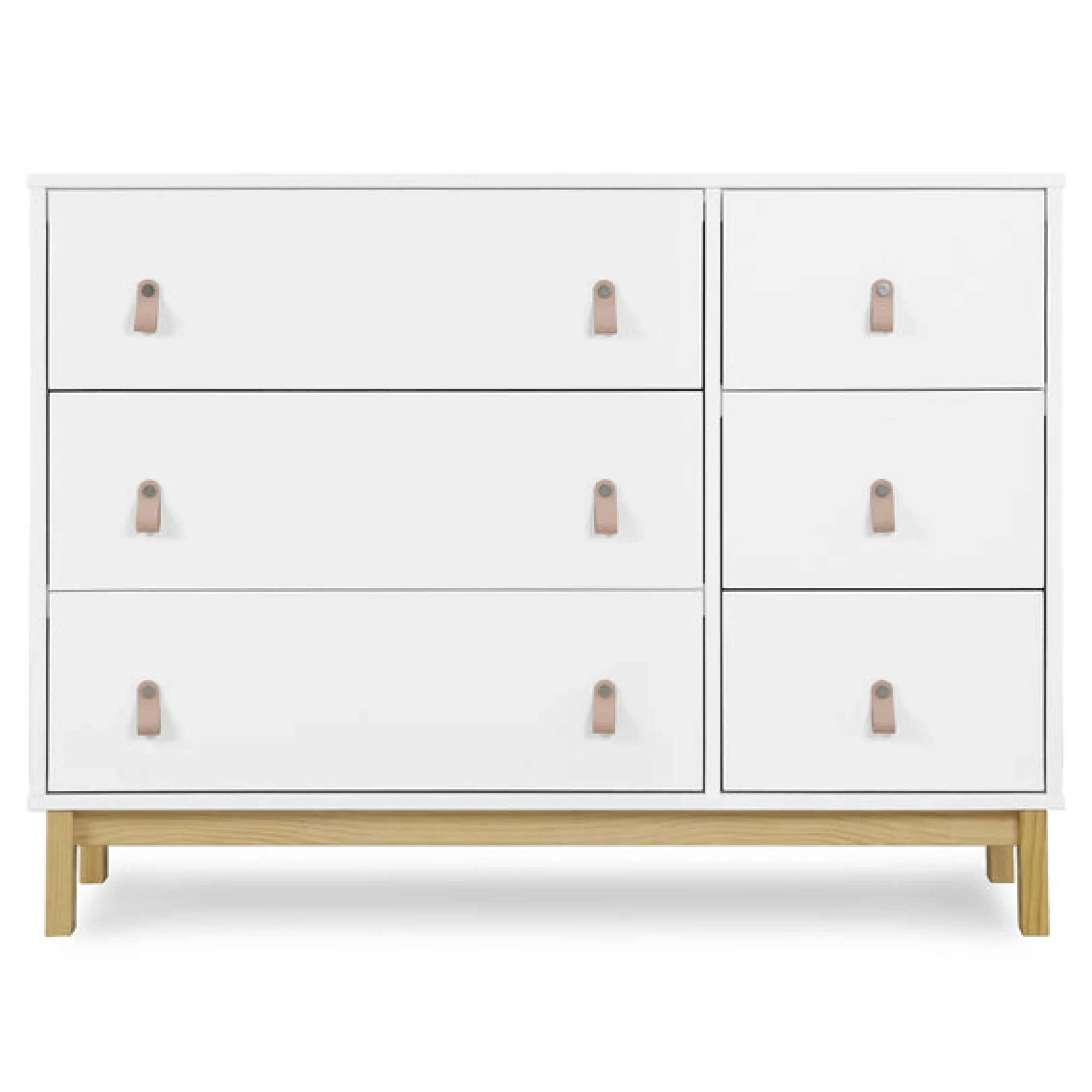 The babyGap by Delta Children Legacy 6 Drawer Dresser with Leather Pulls and Interlocking Drawers is a spacious and stylish storage option. A great addition to any nursery or kids’ bedroom, the leather drawer pulls add a fun detail to the piece. Crafted of sturdy, sustainable materials like New Zealand pine to give it plenty of longevity, this versatile dresser has a mix of small and large drawers to simplify organization. For your child’s safety, this dresser is outfitted with an interlocking drawer system that limits the number of drawers that can be opened at one time. Available in Bianca White/Natural, Navy/Natural and Ebony/Natural. Easily mix, match, and layer with other items from the babyGap Furniture and Bedding Collection. Pair with the coordinating Changing Top #W173810 to convert the dresser into a convenient changing table (Changing Top and changing pad sold separately). This babyGap by Delta Children dresser is tested to meet the current requirements of ASTM F2057, the mandatory CPSC safety standard that protects young children from furniture tip-over incidents. For your children’s safety, only purchase dressers that comply with this standard. For additional security, babyGap strongly recommends that all dressers in your home be anchored; all babyGap dressers include a wall anchor. To learn how to properly secure your dresser, please see the product assembly instructions or visit our website.
