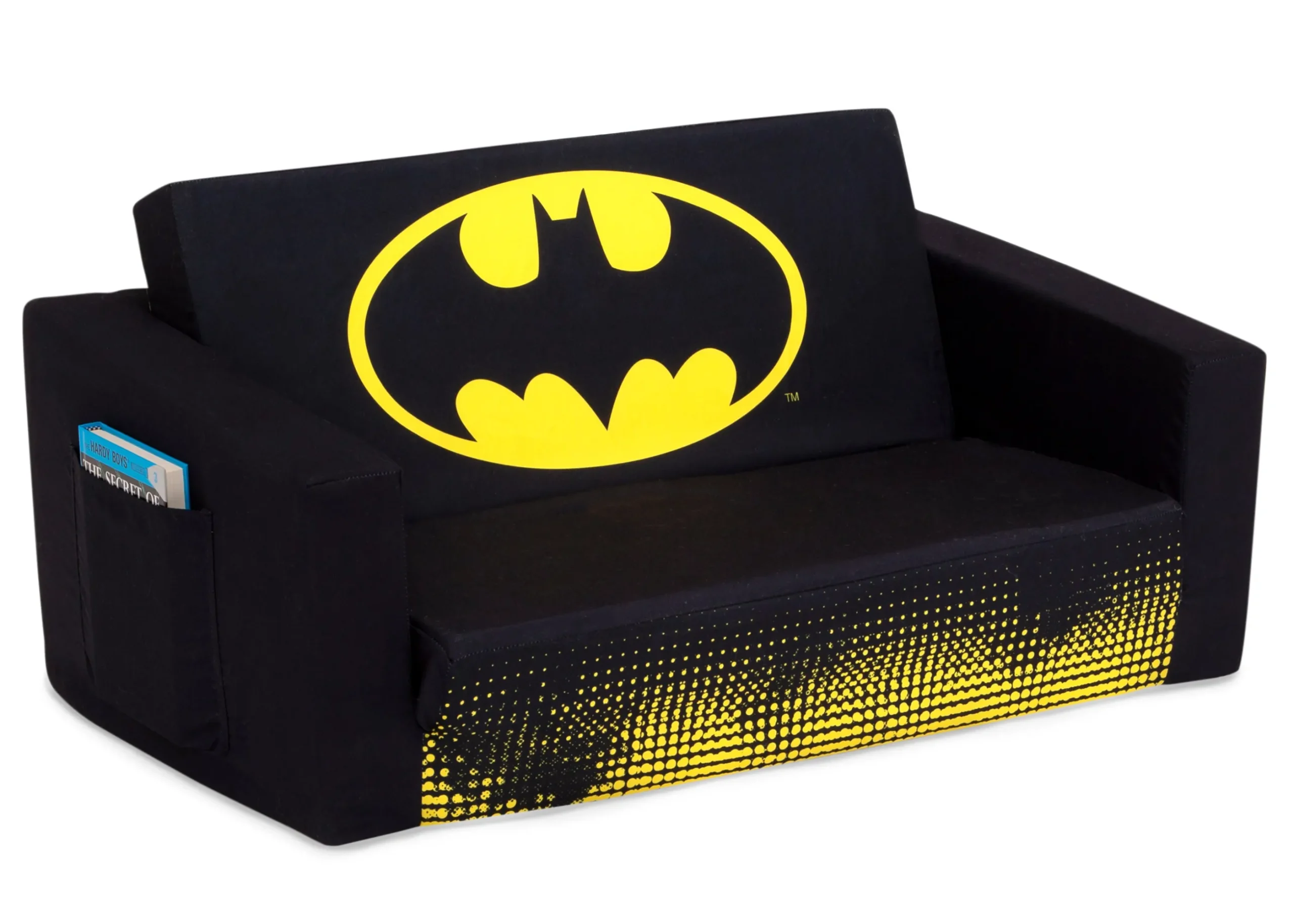 The Batman Cozee Flip-Out Sofa by Delta Children is a cozy sofa by day, laid-back lounger by night. This convertible seat easily flips open for multiple ways for your child to relax–they’ll love to sit and read or watch their favorite movies on the sofa but when it’s time for a nap, this seat folds out into a comfy sleeper bed. Plus, when the chair is flipped open it reveals colorful Batman artwork. Big enough to 2 to 3 small kids comfortably in sofa mode, it’s light enough to move around the house and is ideal for your children to share during playtime or sleepovers. The super-soft slipcover with easy-to-reach side pocket is treated with a Scotchgard stain release finish to resist stains, ensuring the chair looks beautiful for years to come! The supportive foam construction will keep its shape and provides all-day comfort. Designed to ship in a super-small box, this lightweight foam kids’ sofa and lounger may take up to 24 hours to fully expand once unboxed. Machine-washable slipcover zips off for easy cleaning. Recommended for ages 18 months+.