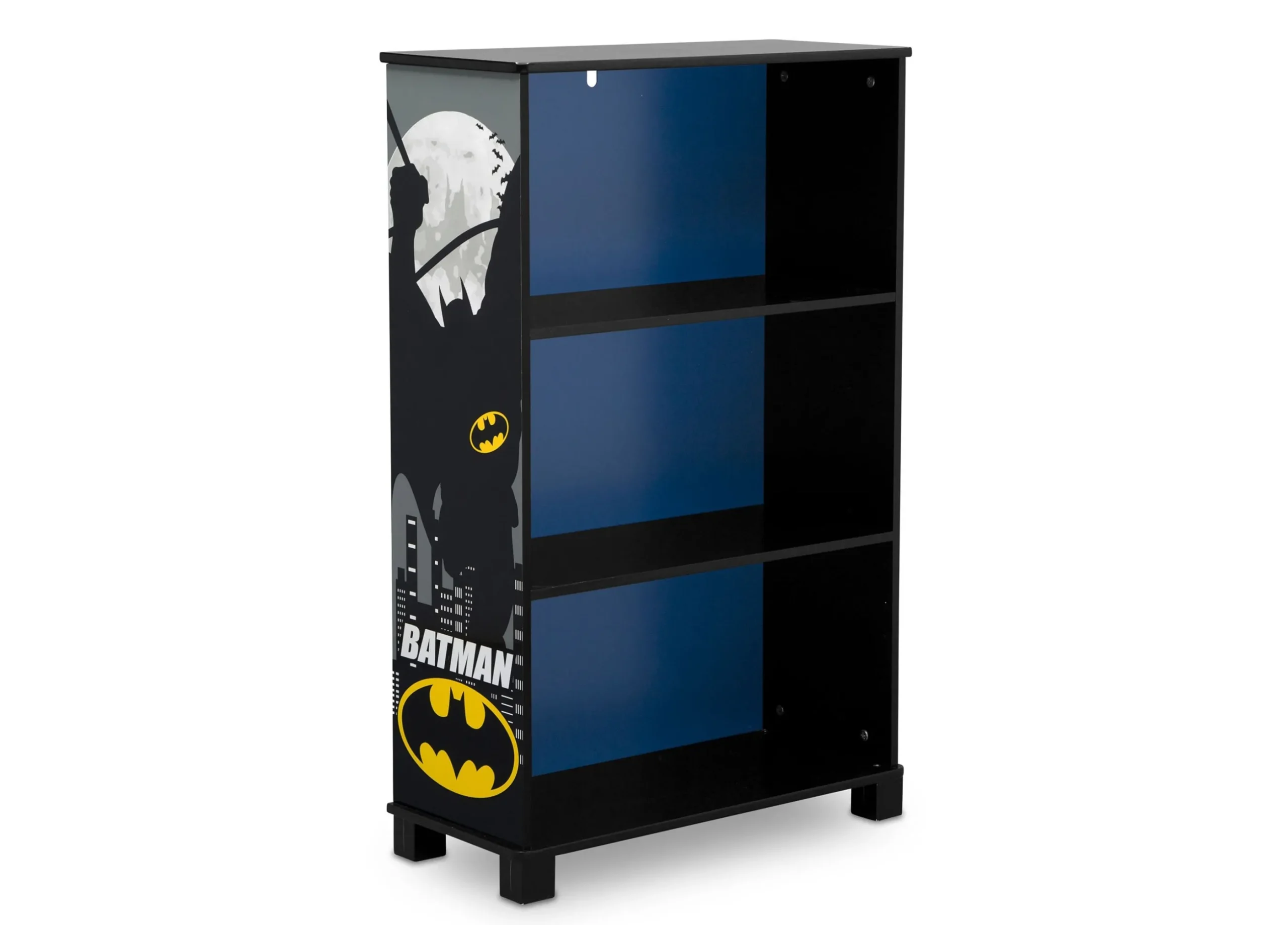 Complete your Bat cave with this DC Comics Batman Deluxe 3-Shelf Bookcase from Delta Children. The three spacious shelves are at the perfect height level to allow kids to easily store books, photos and toys. The colorful artwork of Batman and Gotham City on the side panels packs some cool style that will encourage growing super heroes to cleanup in record time. Built from sturdy wood, this durable bookcase will be able to withstand years of use, and is perfect as storage in the bedroom, playroom, living area-pretty much anywhere.