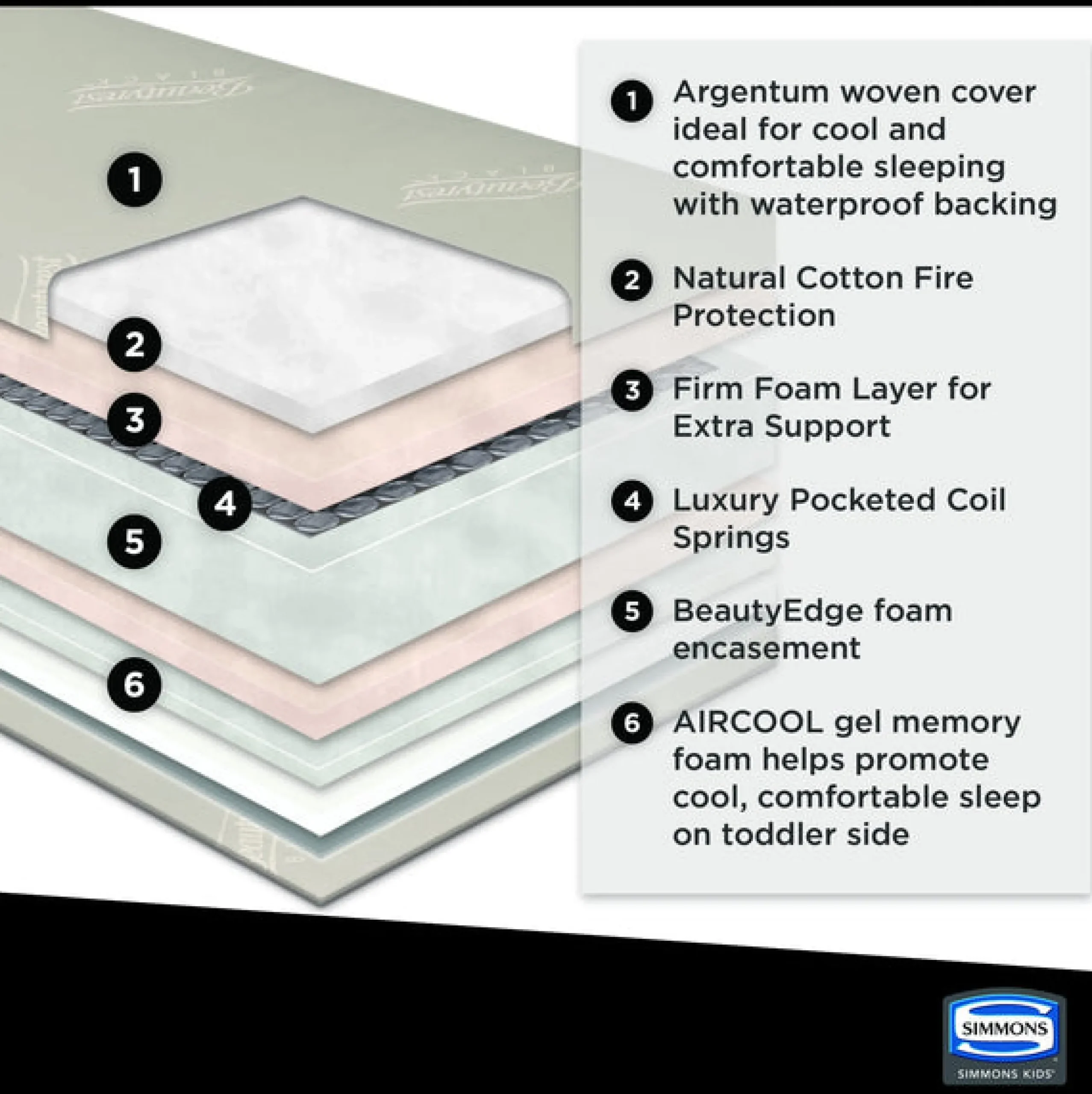 The Beautyrest Black AIRCOOL Two-Stage Crib and Toddler Mattress features innovative technologies to give your child safe, comfortable and restorative sleep. At the core of the mattress, 231 luxury pocketed coils springs provide a firm foundation, while the BeautyEdge foam encasement ensures the mattress is stable all around. Designed to deliver the precise level of support each age range requires, this mattress has two distinct sides—the infant side is the ideal firmness level babies need, and the toddler side features a layer of high performance AirCool gel memory foam to keep your child a comfortable temperature. To help achieve the ideal sleeping experience, this mattress is topped with an Argentum+ woven fabric cover that combines moisture wicking technology with natural silver ion antibacterial properties for a cool, comfortable surface.