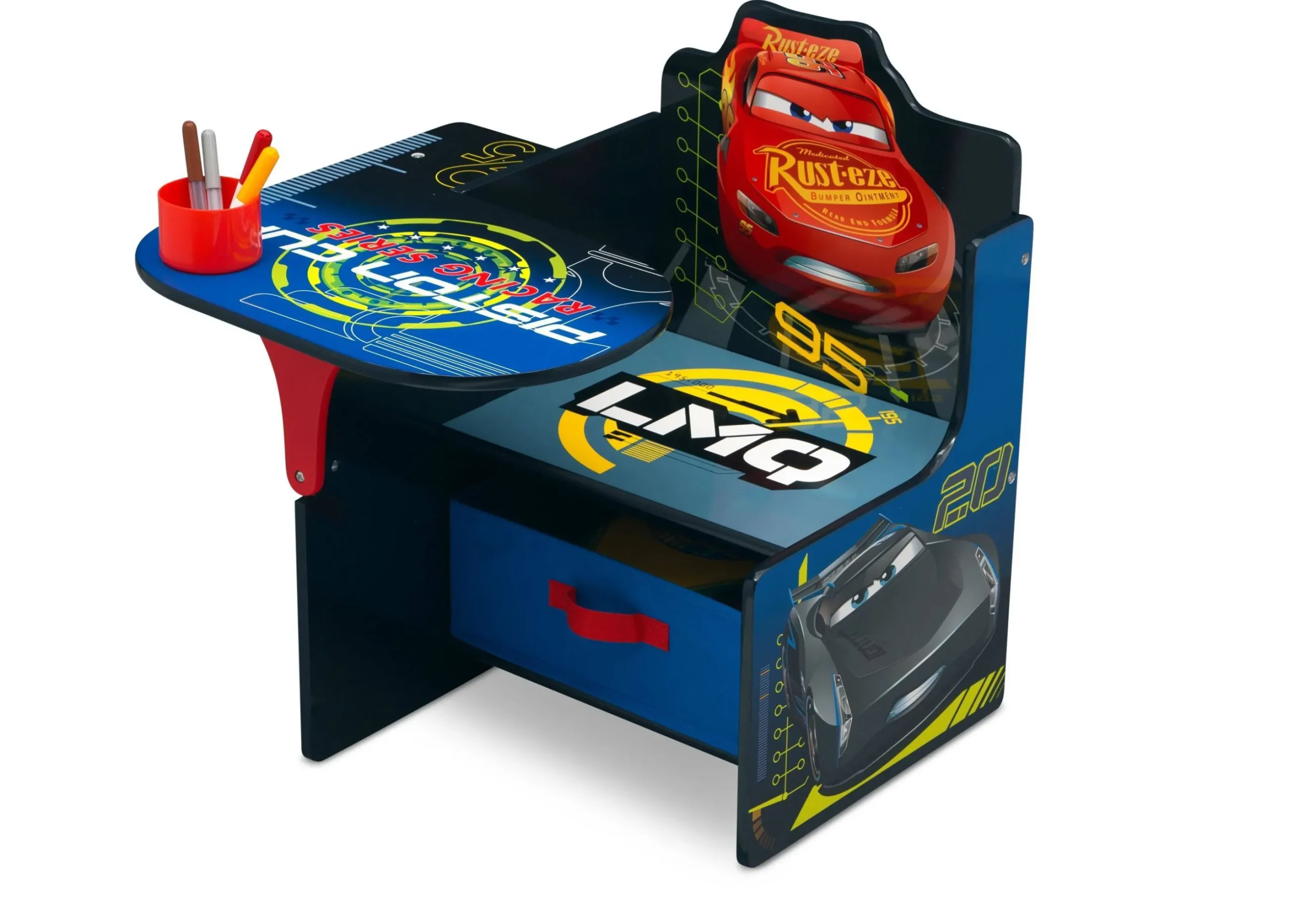 The Cars Chair Desk equips your little speedster with a versatile place to sit, snack or do school work. Colorful graphics of Lightning McQueen and newcomer Jackson Storm reveals the magic of the movie while a handy storage bin and cup holder provides plenty of space for their gear.
