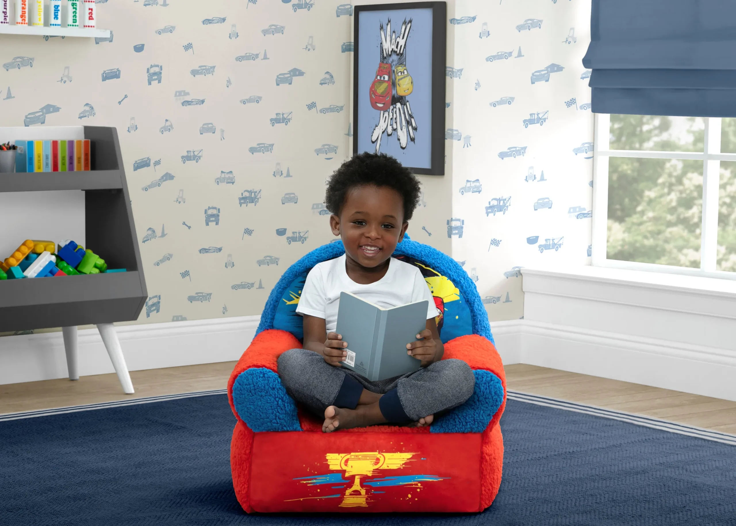 Kids can snuggle up with their favorite character with the Cars Cozee Buddy Chair by Delta Children! This plush chair features colorful Cars graphics of Lightning McQueen, super-soft fabric and a handle that makes it easy to move around the house! The foam design of this comfy chair offers kids a cozy companion for reading, relaxing or snuggling, making it perfect for playrooms and kids’ bedrooms.