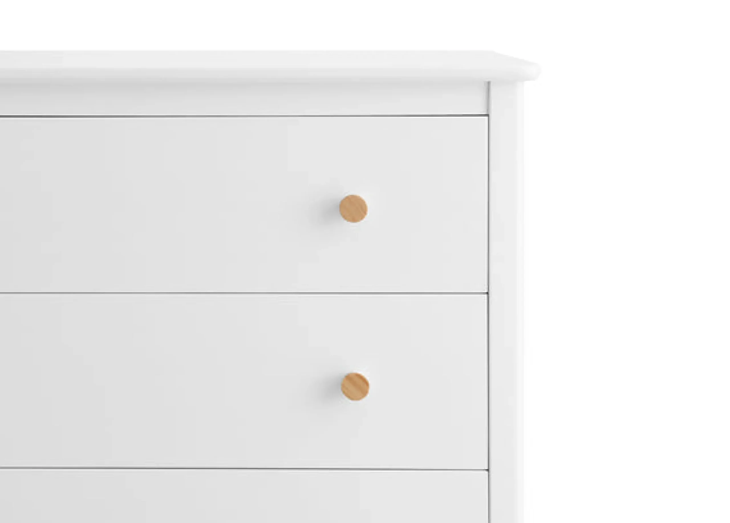 For your child’s safety, this dresser is outfitted with an interlocking drawer system that limits the number of drawers that can be opened at one time. Dresser includes tipover restraint (safety anchor) for you to securely attach it to your wall. We know chemicals have no place in your house, so we use a non-toxic multi-step painting process that is lead and phthalate safe. Made of sustainable woods like New Zealand Pine, Rubberwood and TSCA compliant engineered wood