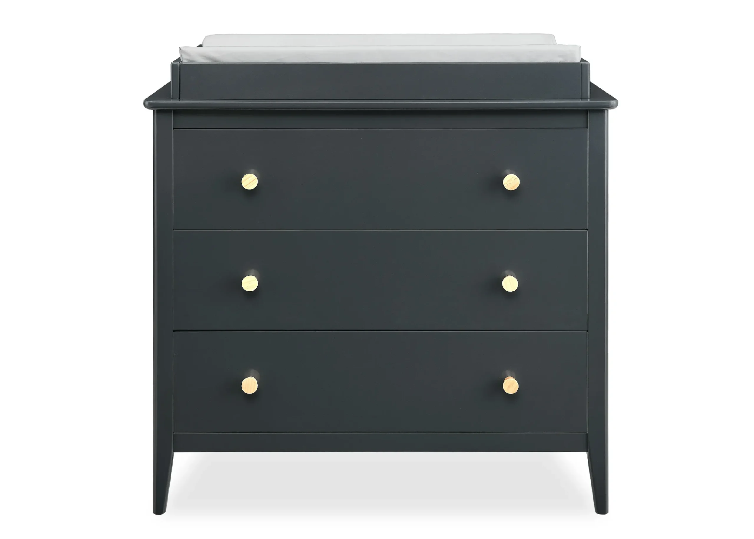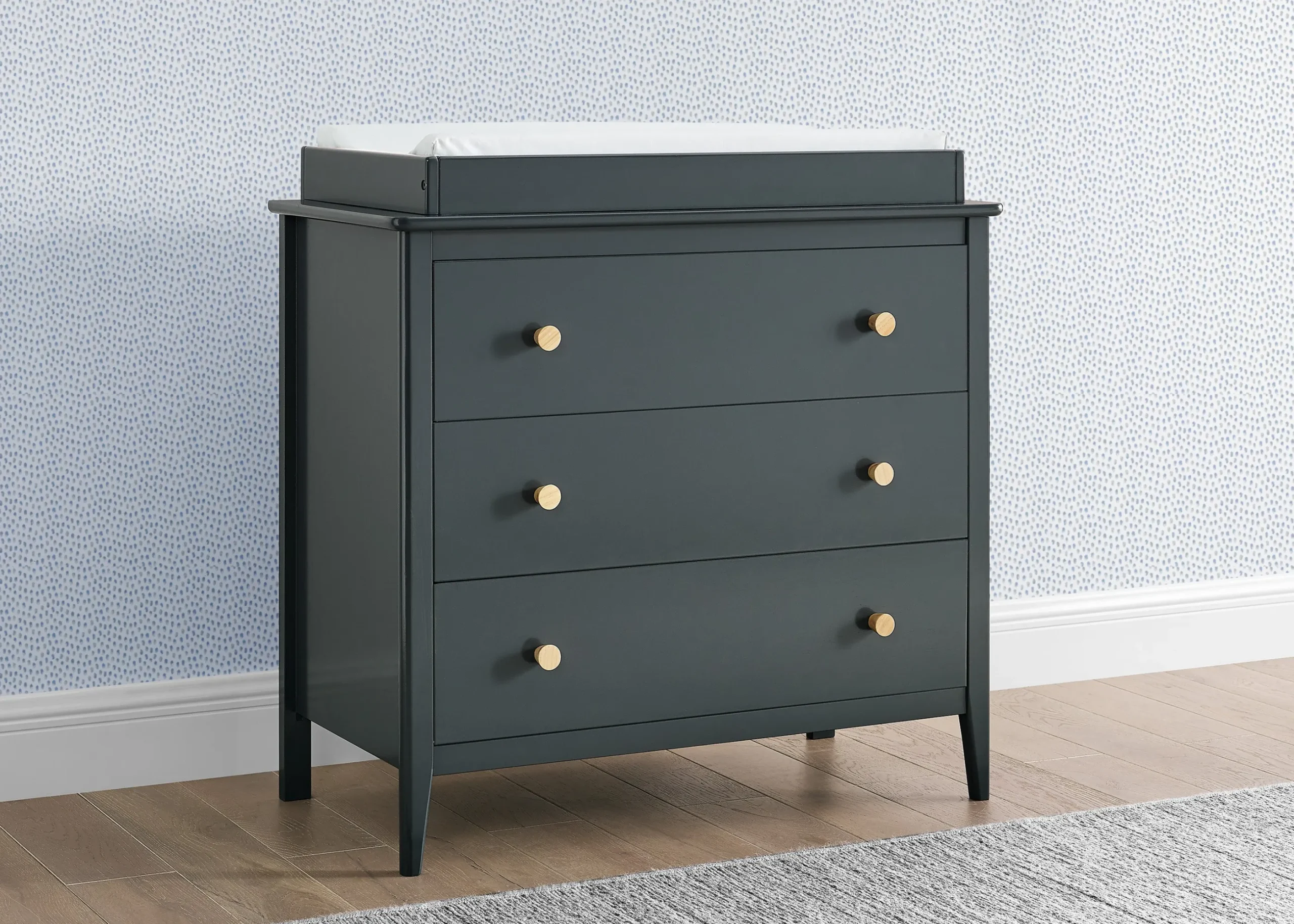 The Casey 3 Drawer Dresser by Delta Children will instantly elevate your nursery with its mid-century modern style. Clean lines, playful round knobs, and tapered legs define this beautiful dresser. This dresser also has a smooth metal glide system with safety stops that prevent drawers from pulling out, so it is easy and safe for kids to manage on their own. Pair this dresser with other pieces in the Casey Collection for a coordinated look, as well as the coordinating Changing Top #W100810 (sold separately) to transform this dresser into a convenient changing table