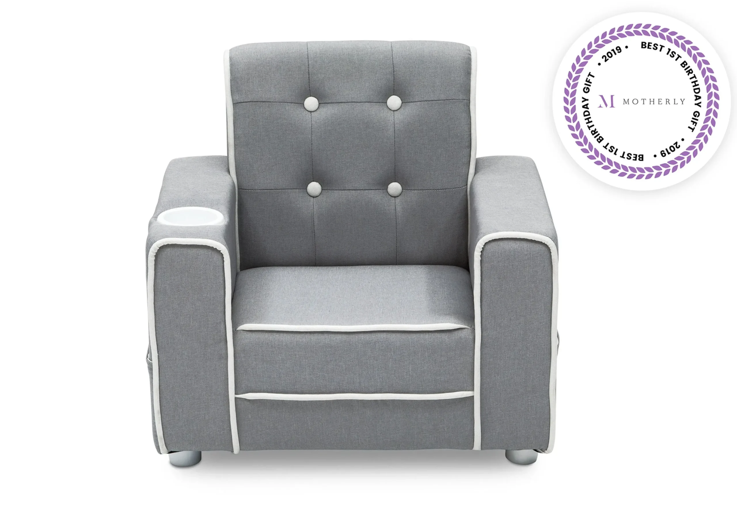 The Chelsea Kids Upholstered Chair with Cup Holder from Delta Children will give your little one a comfy place to read or relax. Button tufting on the back and contrasting piping adds grown-up style to this child-size chair while the built-in cup holder and storage pockets on the sides adds convenience. A chic addition to any children’s bedroom, playroom or the living room, this chair is crafted with a sturdy wood base and a generous foam fill to ensure it is as comfortable as it is stylish. Chair coordinates with other items in the Chelsea Collection from Delta Children.
