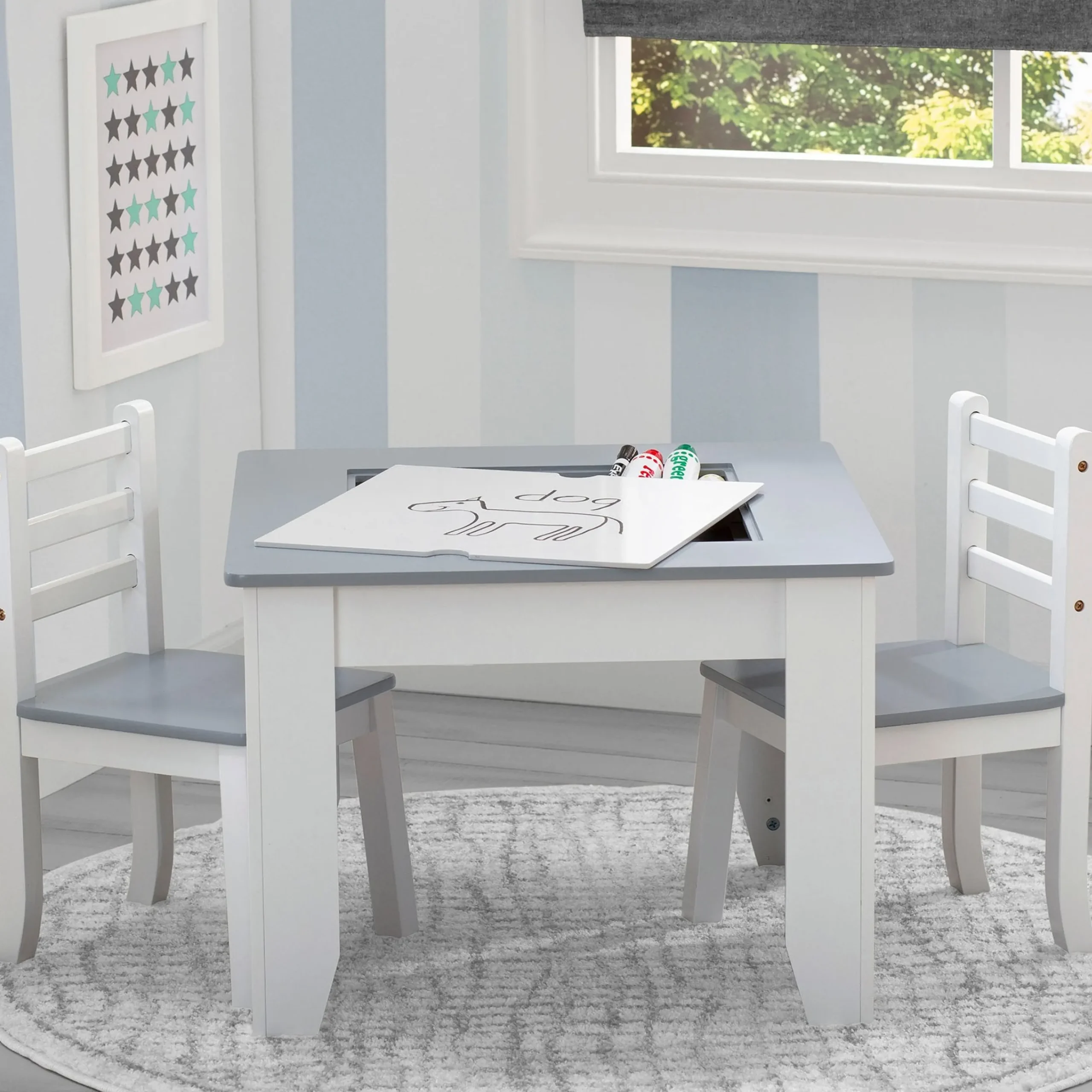Kids will love getting crafty with the Chelsea Chair Set and Table from Delta Children! It has a double-sided art surface that features a dry erase board that flips into a chalkboard. Underneath the art surface an easy-access storage compartment for markers, paintbrushes, toys and other items. The perfect play table for art projects, tea parties, snacks and more, the Chelsea Chair Set and Table will make a great addition to any room. The table’s modern two-tone design in contemporary shades of grey and white ensures it will look equally cool in the playroom or living room. Table coordinates with other items in the Chelsea Collection from Delta Children.