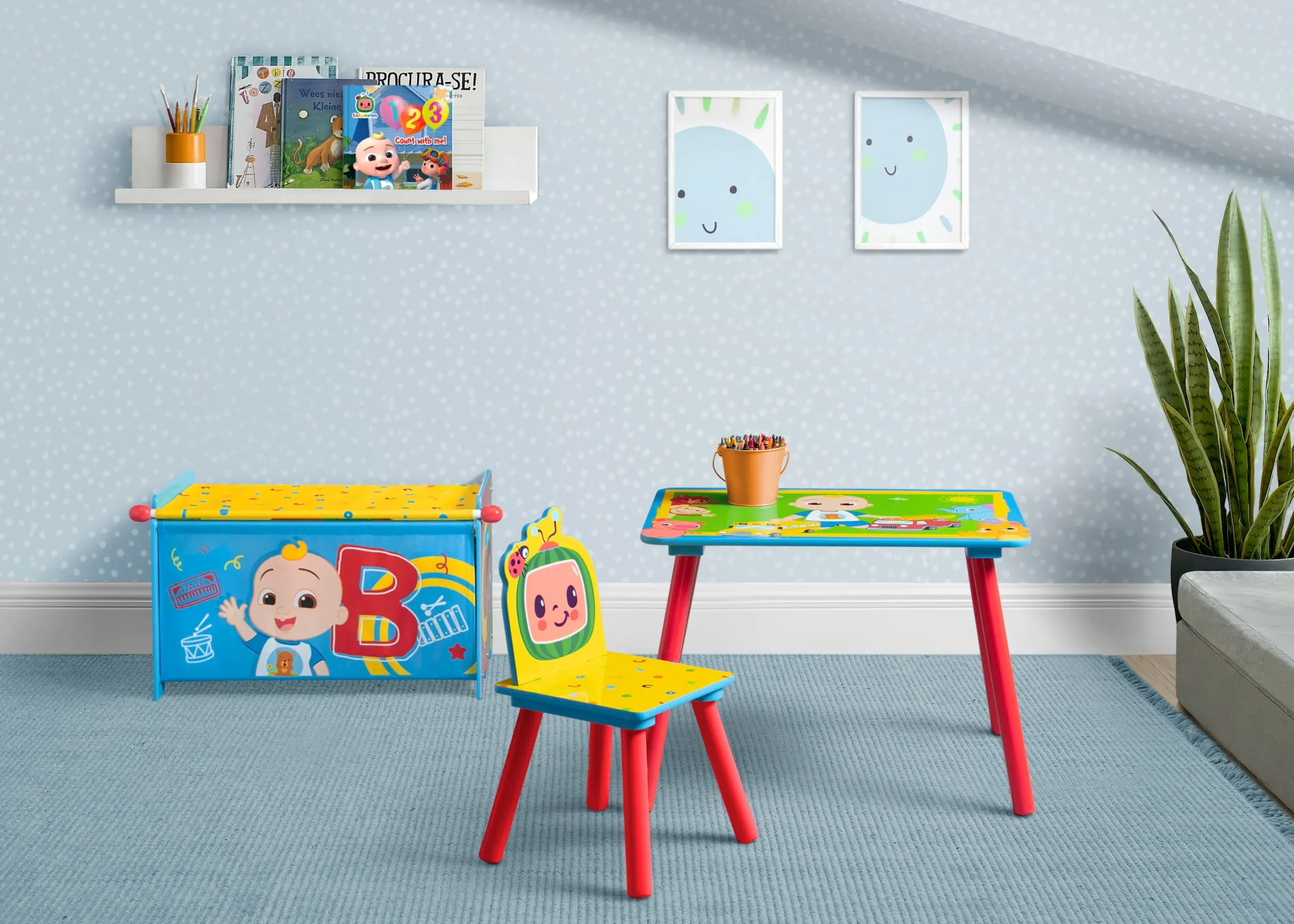 Playtime just got so much cooler with the CoComleon 3-Piece Toddler Playroom Set by Delta Children. A versatile set that provides both seating and storage, it includes a wooden play table with a chair and a toy box. The wooden play table and chair are the perfect kid-size height and feature bold CoComelon graphics. The toy box features a retractable top and spacious interior to hold books, blocks, and more. Built from sturdy materials, these pieces will standup to years of playtime.