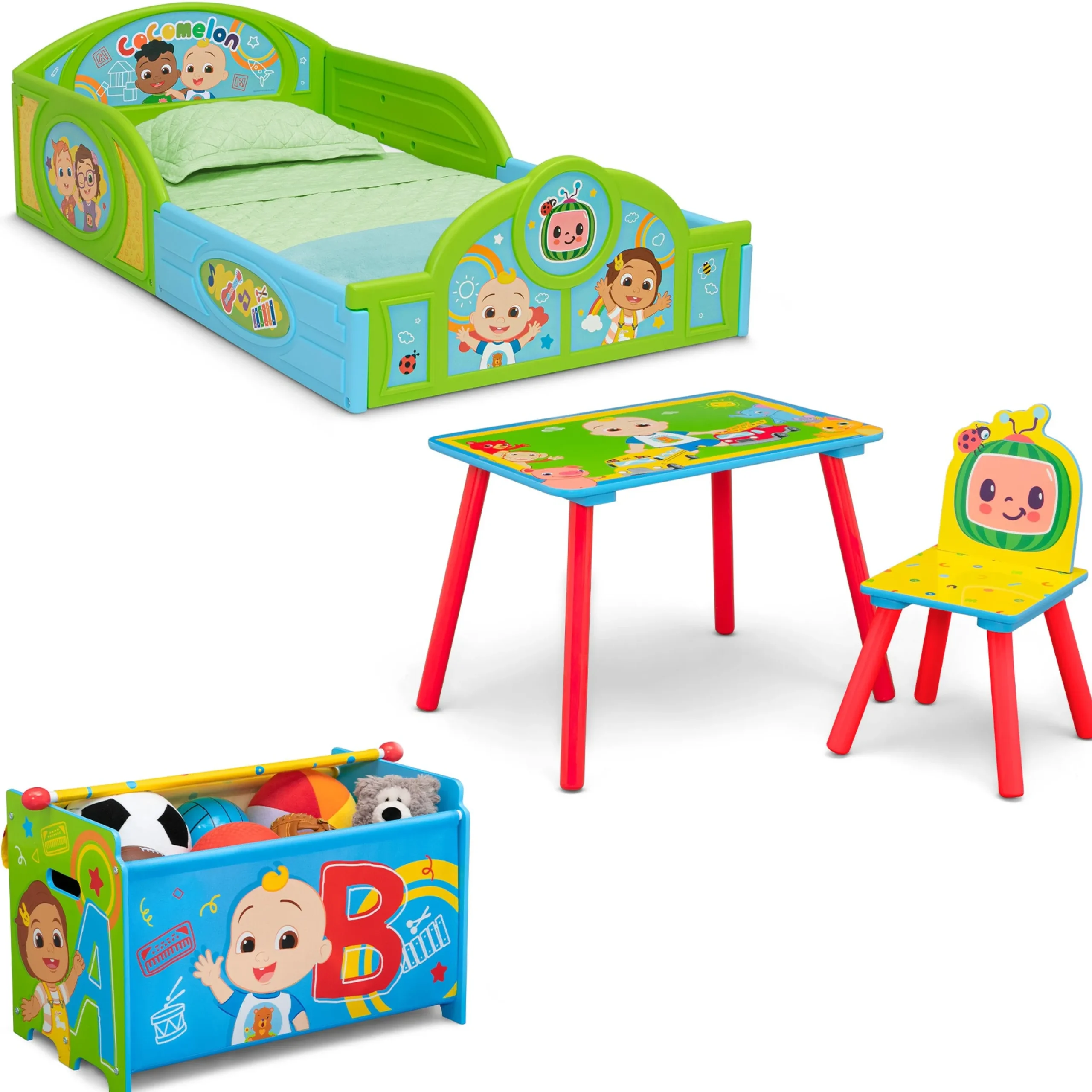CoComelon 4-Piece Toddler Room-in-a-Box Set – Includes Sleep and Play Toddler Bed, Table, 1 Chair and Toy Box