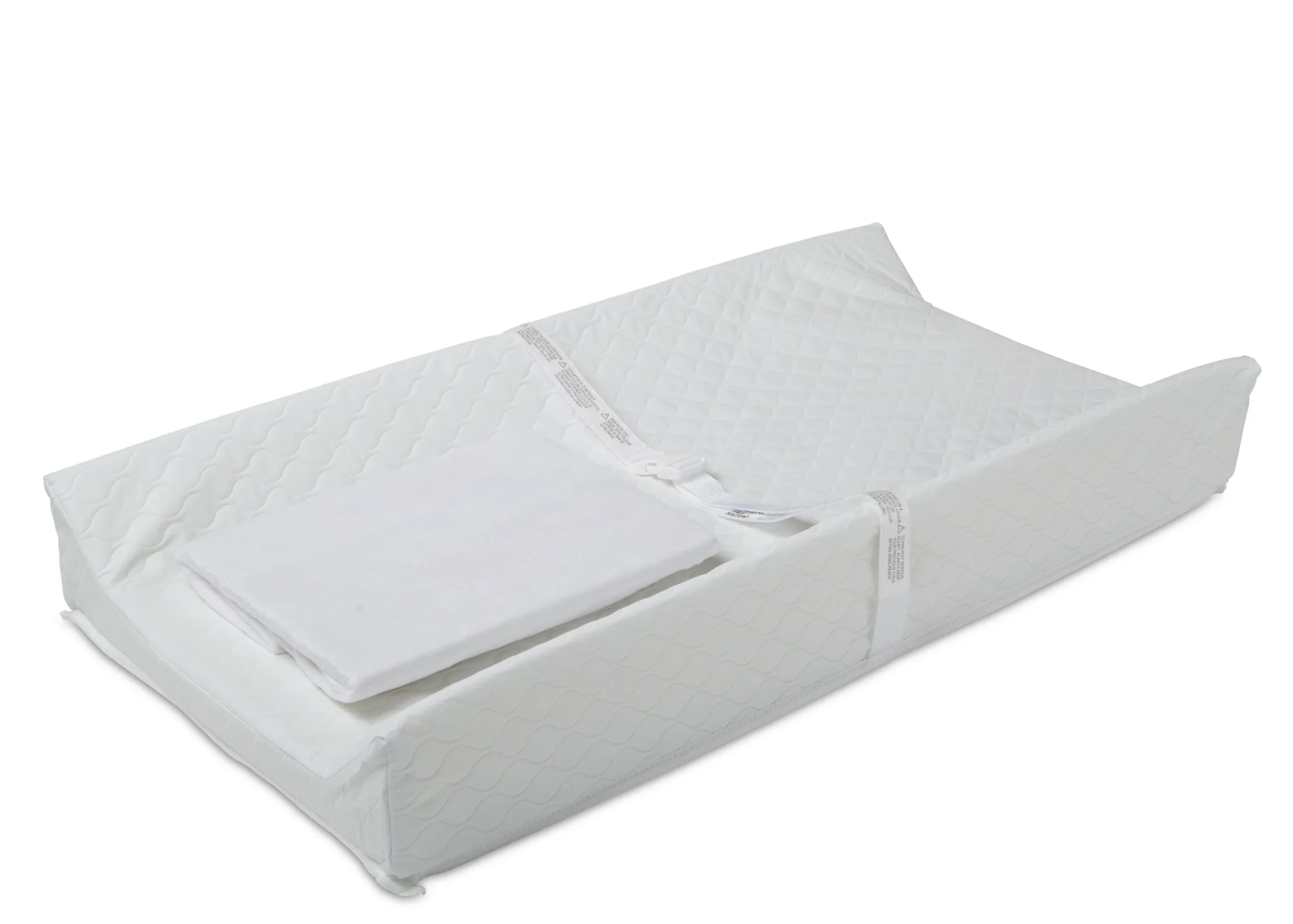 Your baby will be comfortable and safe come changing time with the ComforPedic from Beautyrest Contoured Changing Pad with Plush Cover! Designed with contoured sides and a quick release safety belt, this changing pad ensures your baby is secure while you change or dress them. Changing pad is quilted and waterproof to help make it easy to clean. Plus, this changing pad features straps that easily adhere to your dresser or changing table to create a completely safe changing area. Fits most changing tables.