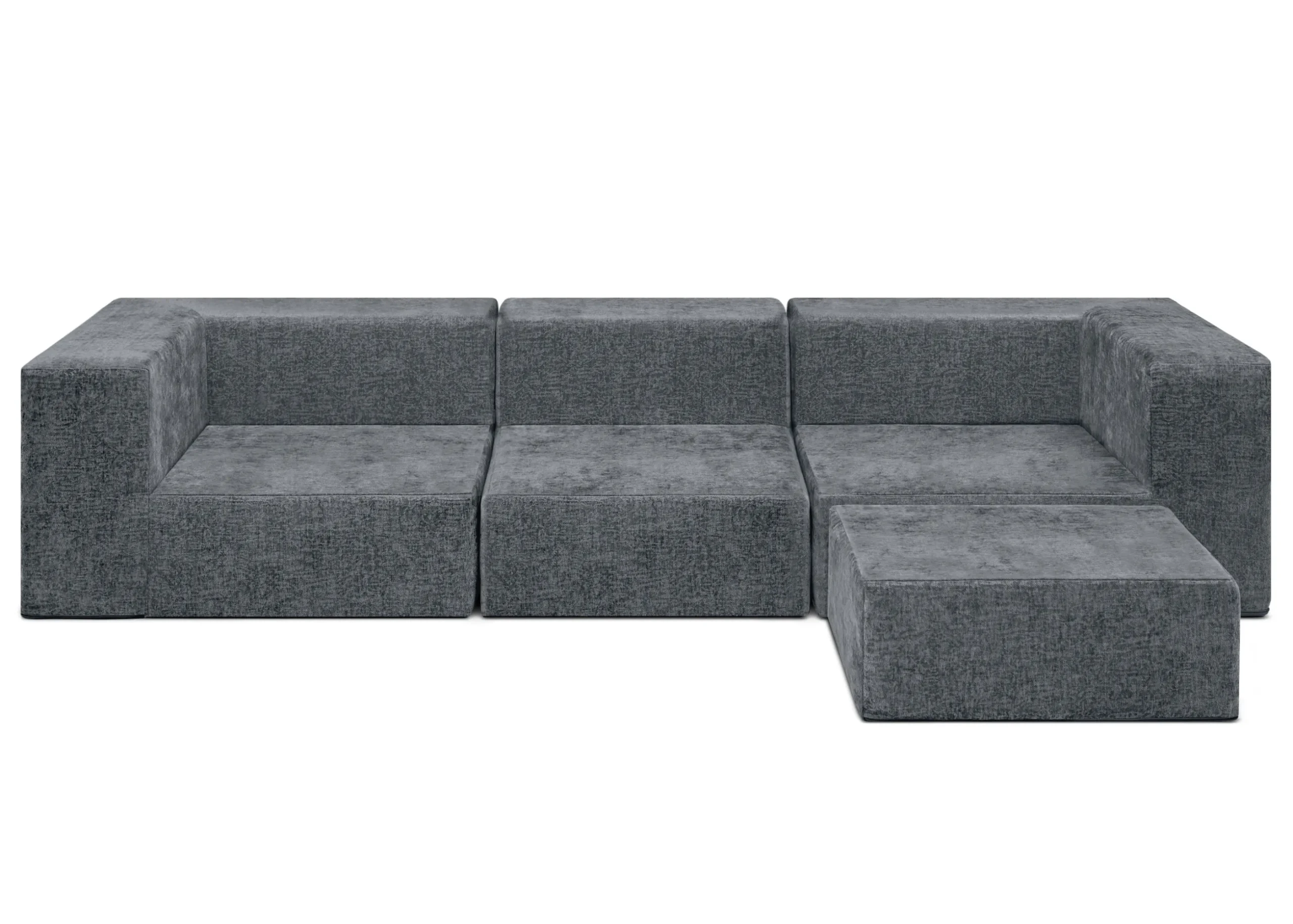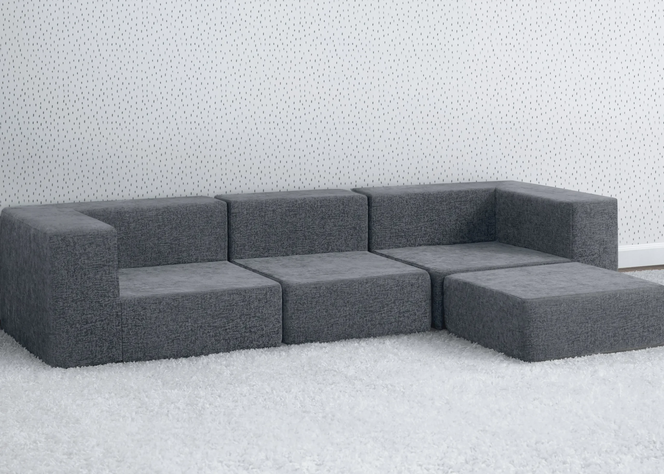 There’s a reason this couch is called the Cozee 4-Piece Sectional Sofa Set. This 4-piece sectional sofa is made up of two corner chairs, one armless chair and an ottoman that feature a plush foam construction that invites kids to pile on. Designed with the whole family’s comfort in mind, this sofa may be made for kids, but adults will find it comfy, too! Arrange and rearrange the pieces for lounge seating that’s perfectly configured to your space. Hook and loop closures securely attach each piece and non-slip bottoms keep it in place. And don’t worry about spills or sticky fingers, the sofa’s chenille slipcovers are treated with a Scotchgard stain release finish, plus they zip right off, so you can throw them in the washing machine. To customize your sofa, add additional pieces (sold separately), and create the setup of your dreams.