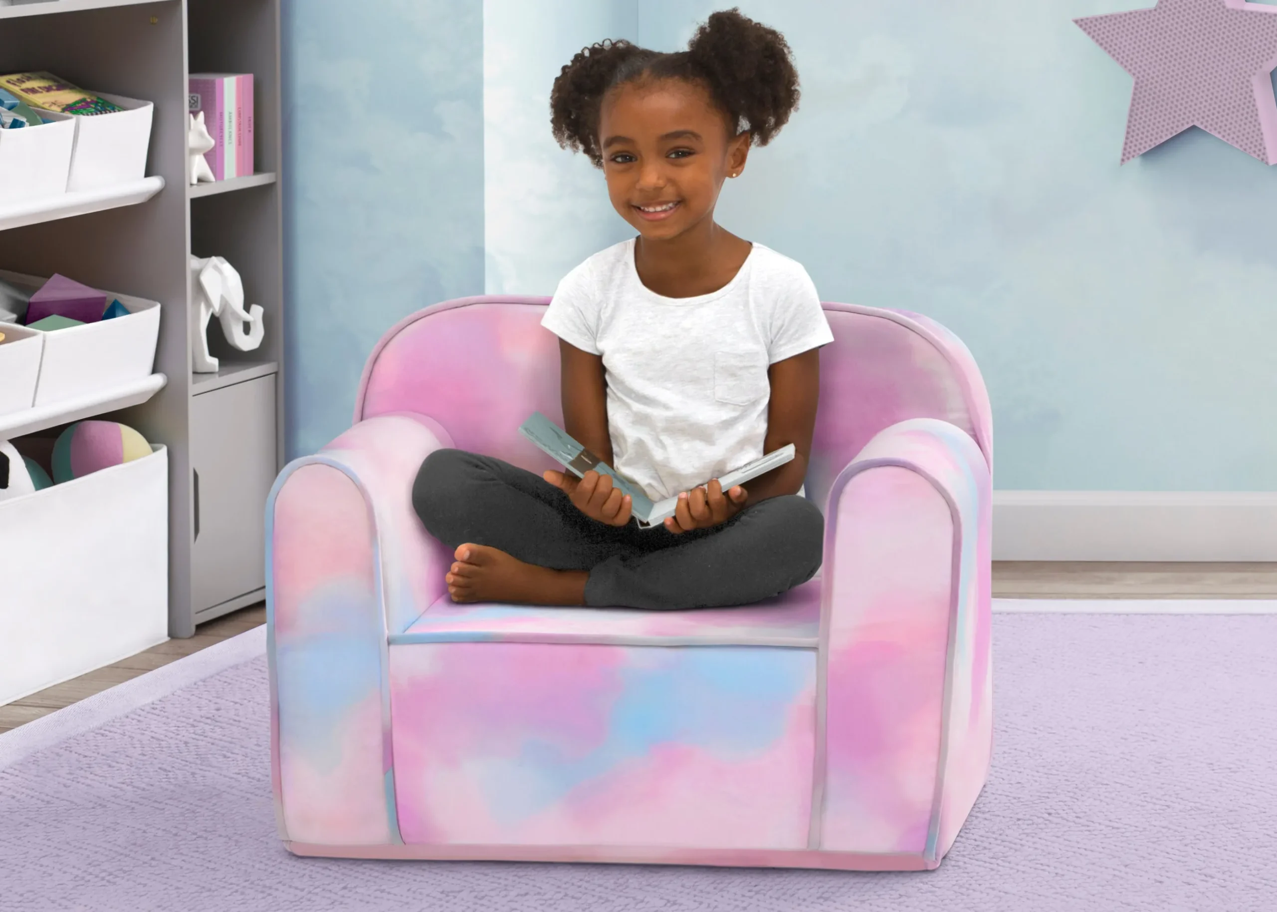 Right-size seating designed just for them, the Foam Cozee Chair by Delta Children will go anywhere they do. Perfect for the playroom, living room or your child’s bedroom, this cozy foam chair is lightweight enough to move from room to room. The slipcover that’s printed with a fun tie dye pattern is constructed of super-soft fabric and is removable and machine washable for easy cleaning. Recommended for ages 18 months+.