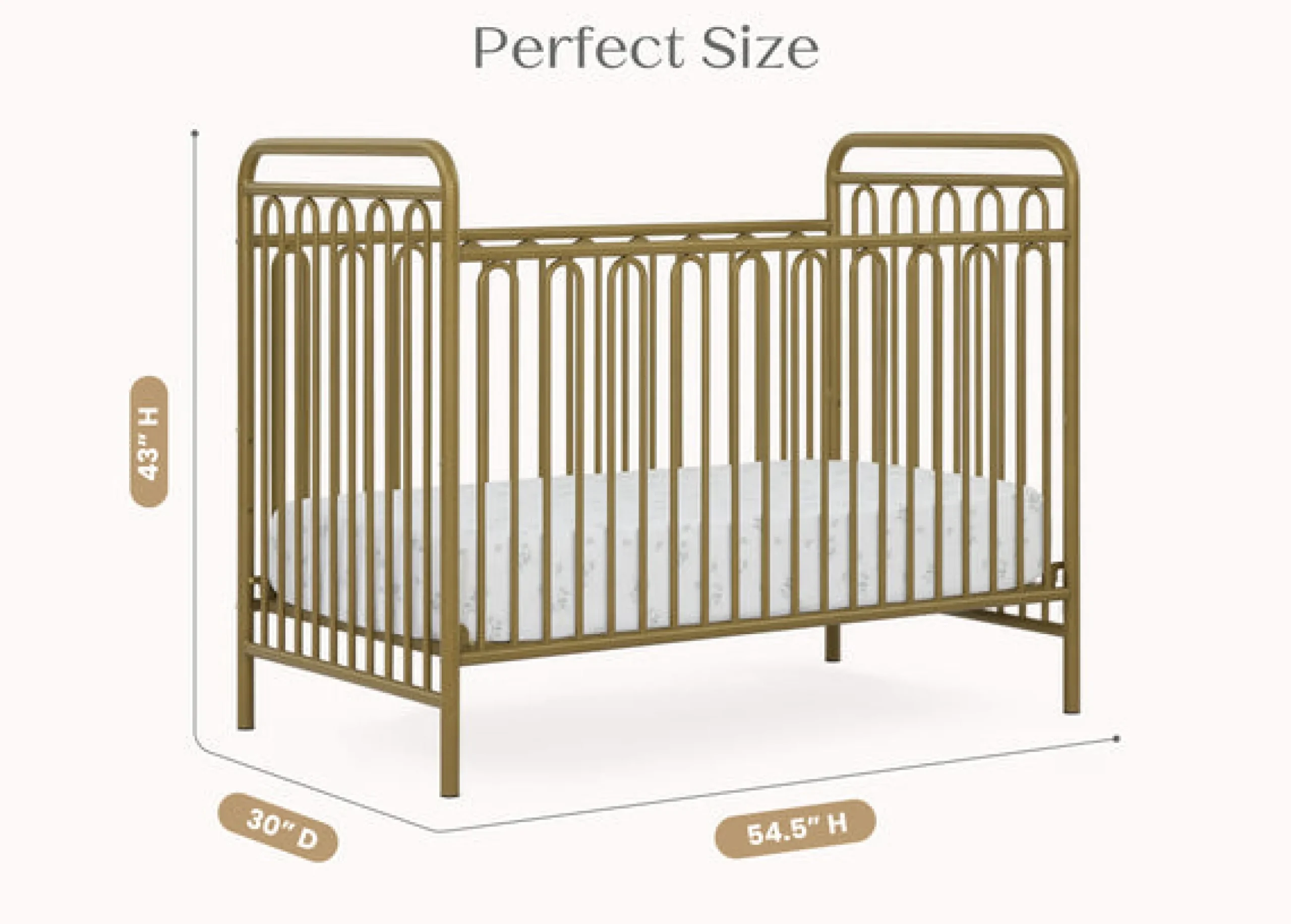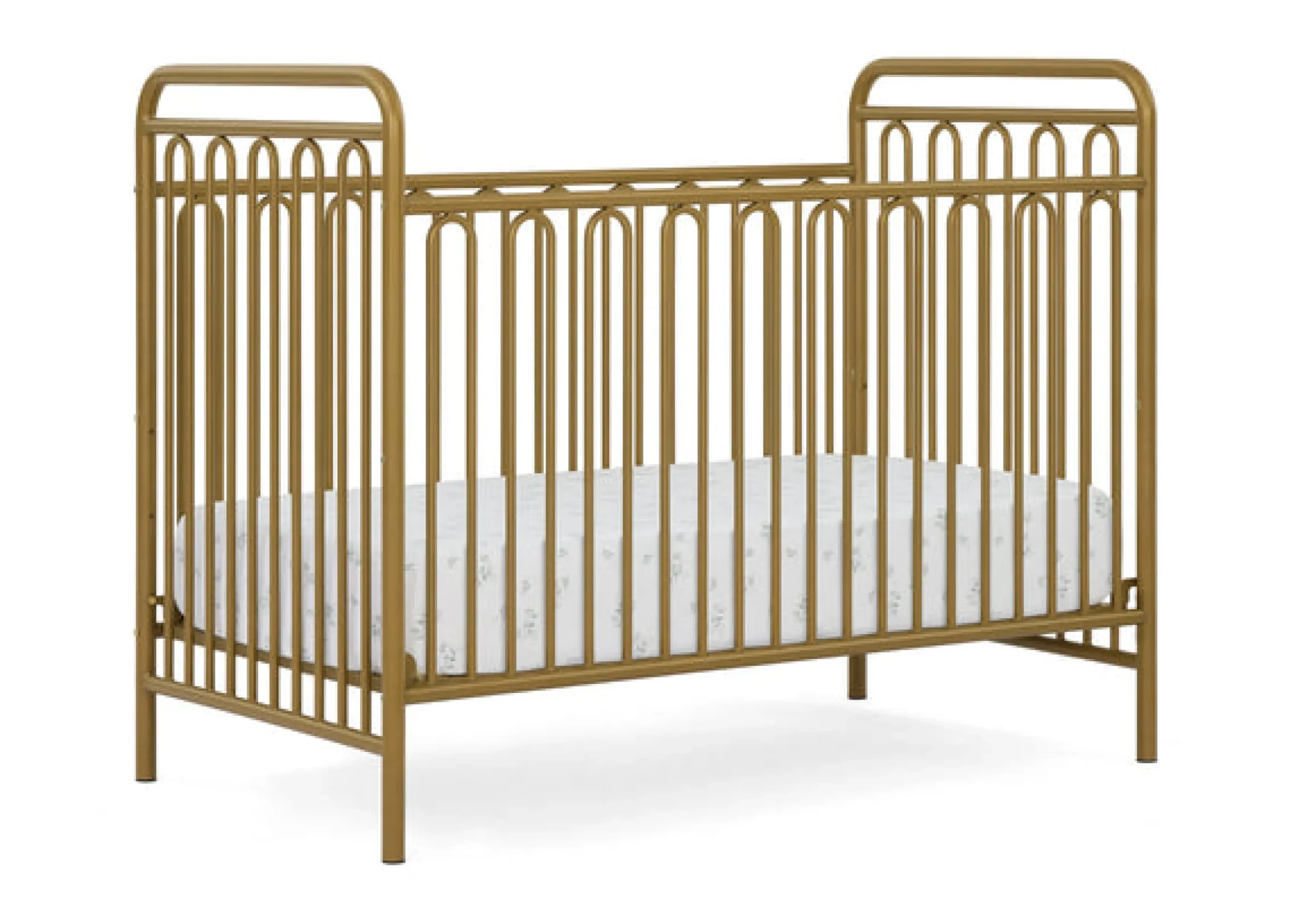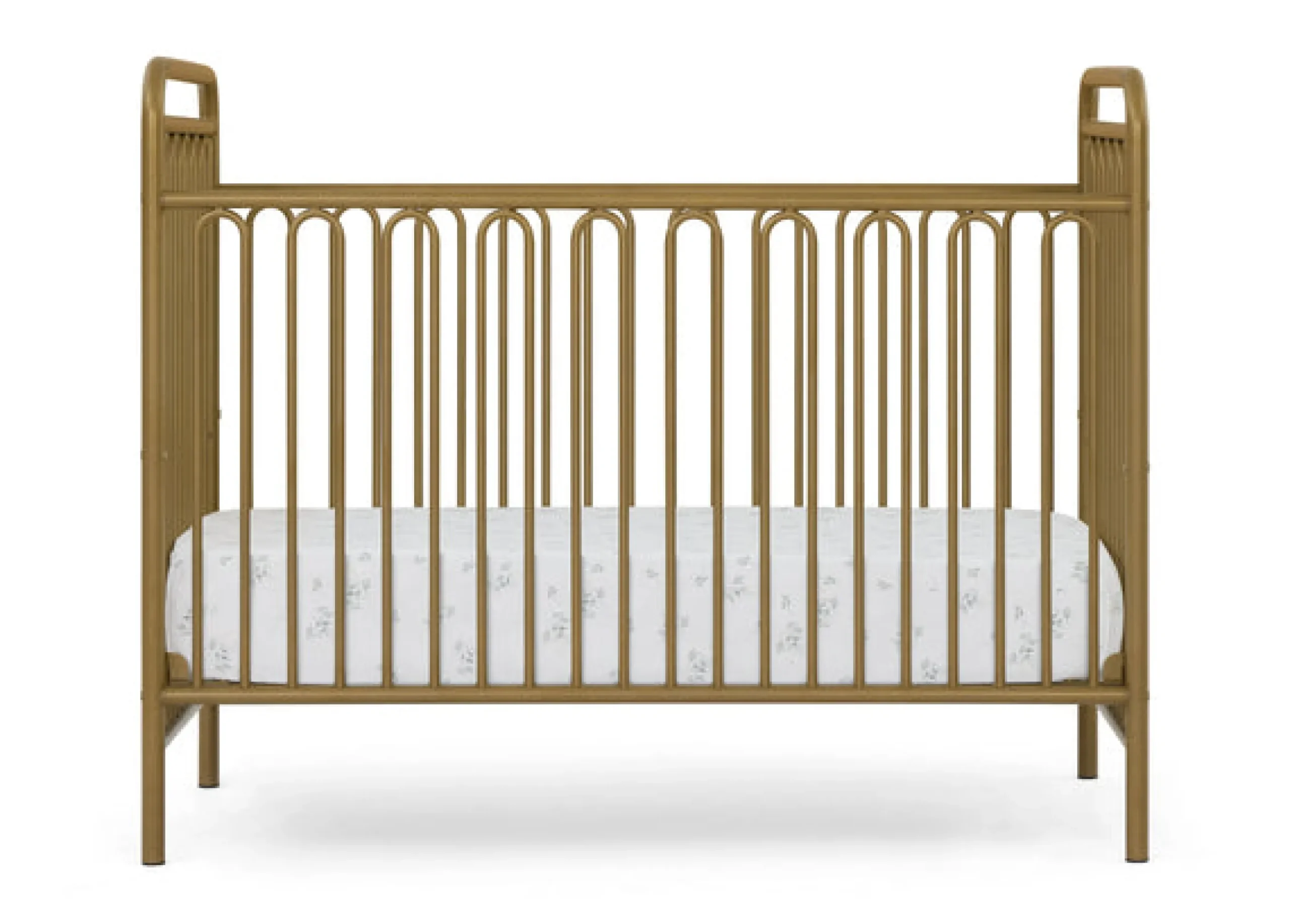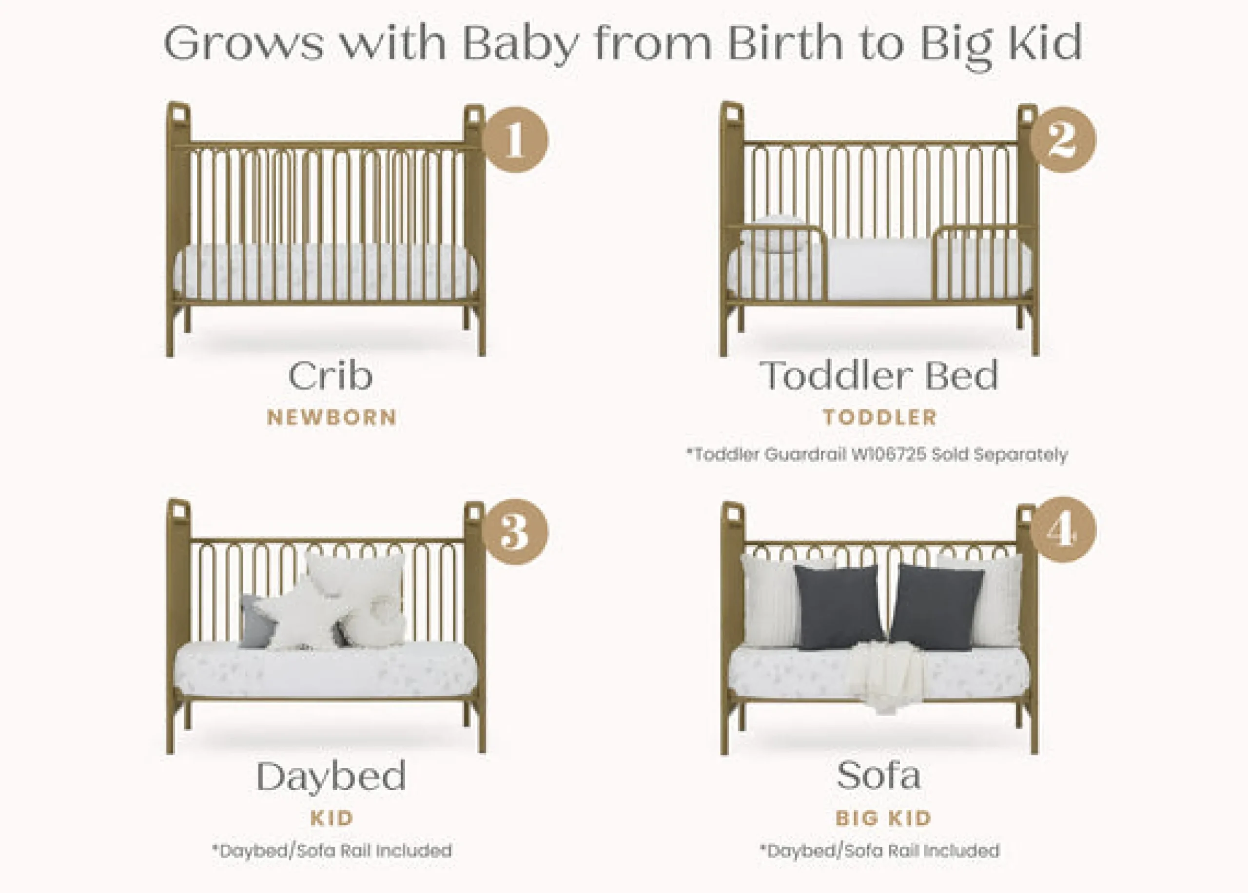 Design your dream nursery with the Darcy 4-in-1 Convertible Metal Crib by Delta Children. Beautifully crafted of premium steel, this vintage-inspired crib with simple curves and round spindles looks like a cherished heirloom but has all the modern features your growing baby needs. Designed to easily convert into a toddler bed, daybed and sofa as your child grows, you can keep this classic look for years to come (Daybed/Sofa Conversion included; Toddler Guardrail #W106725 sold separately). With three mattress positions that easily lower as your baby begins to sit, pull up and stand, you can find the height that’s best for them at every stage. The Darcy 4-in-1 Metal Convertible Crib is designed to fit a standard-size crib mattress (sold separately) and is JPMA Certified to meet or exceed all safety standards set by the CPSC and ASTM.