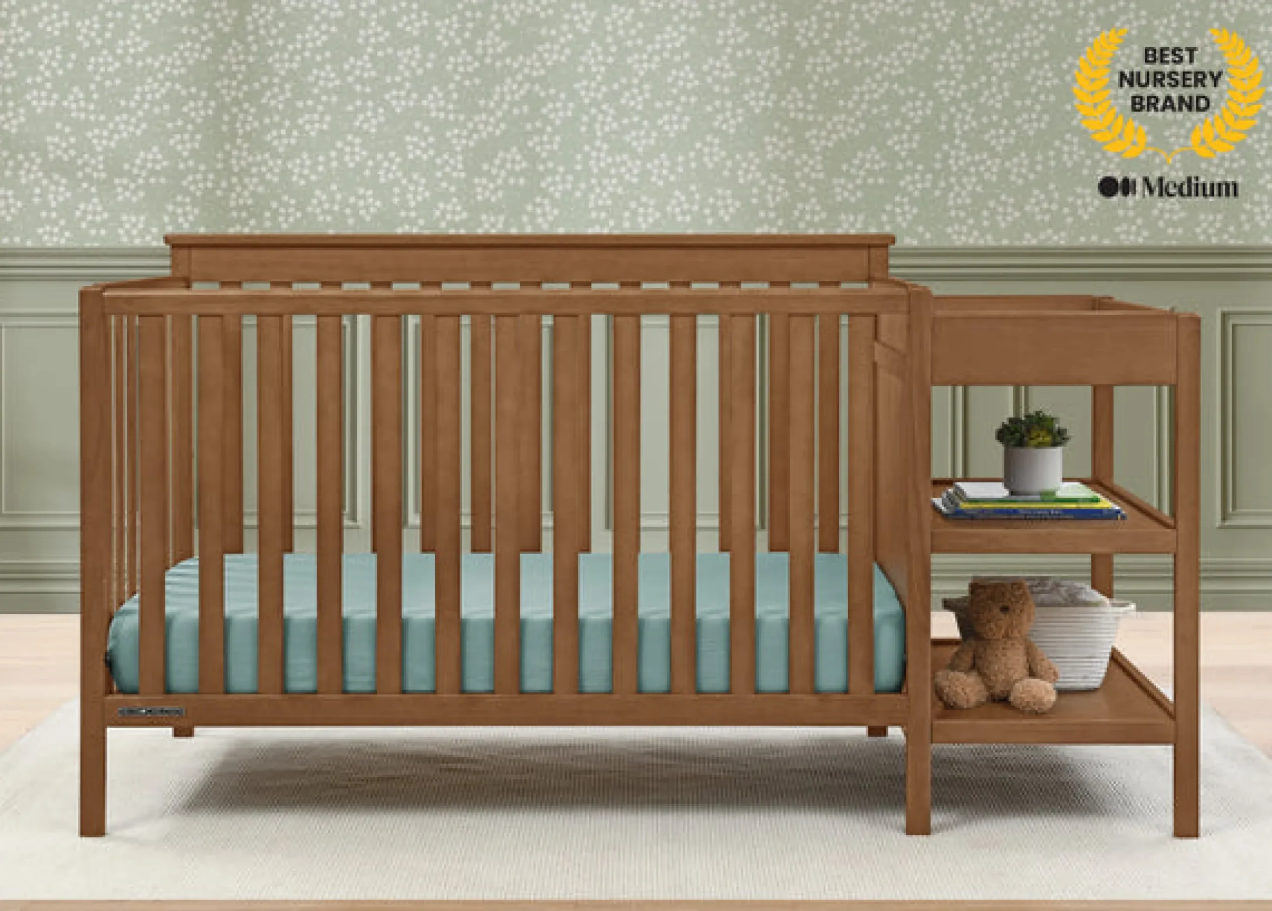 The Ellie 5-in-1 Convertible Crib and Changer by Delta Children is a versatile crib and changer combo that offers both style and functionality. Designed to grow with your baby throughout life’s multiple stages, this crib features three mattress heights, and converts to toddler bed, daybed, sofa and full-size bed (Daybed/Toddler Guardrail Kit #W137725 and standard full size metal bed frame sold separately). The attached changing table with changing pad and two open shelves provides tons of storage for nursery essentials. Plus, it’s GREENGUARD Gold Certified, which means it’s built to contribute to cleaner air for a healthy home. Crib mattress sold separately.